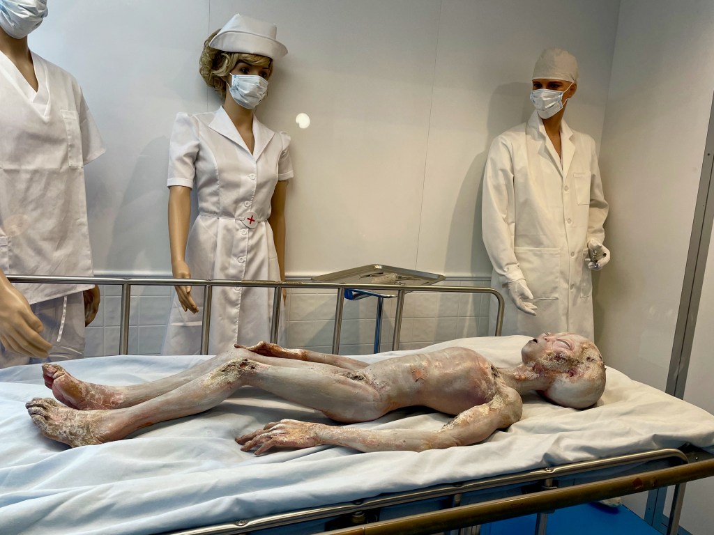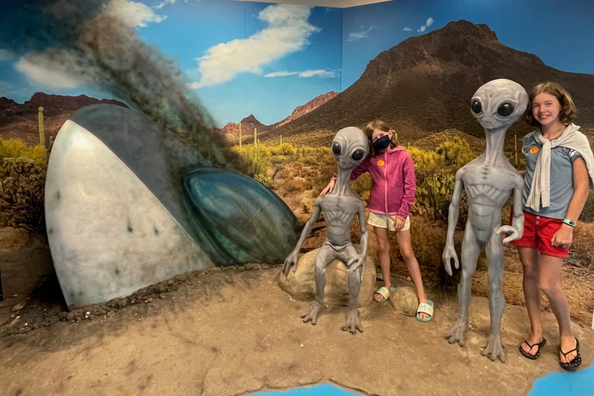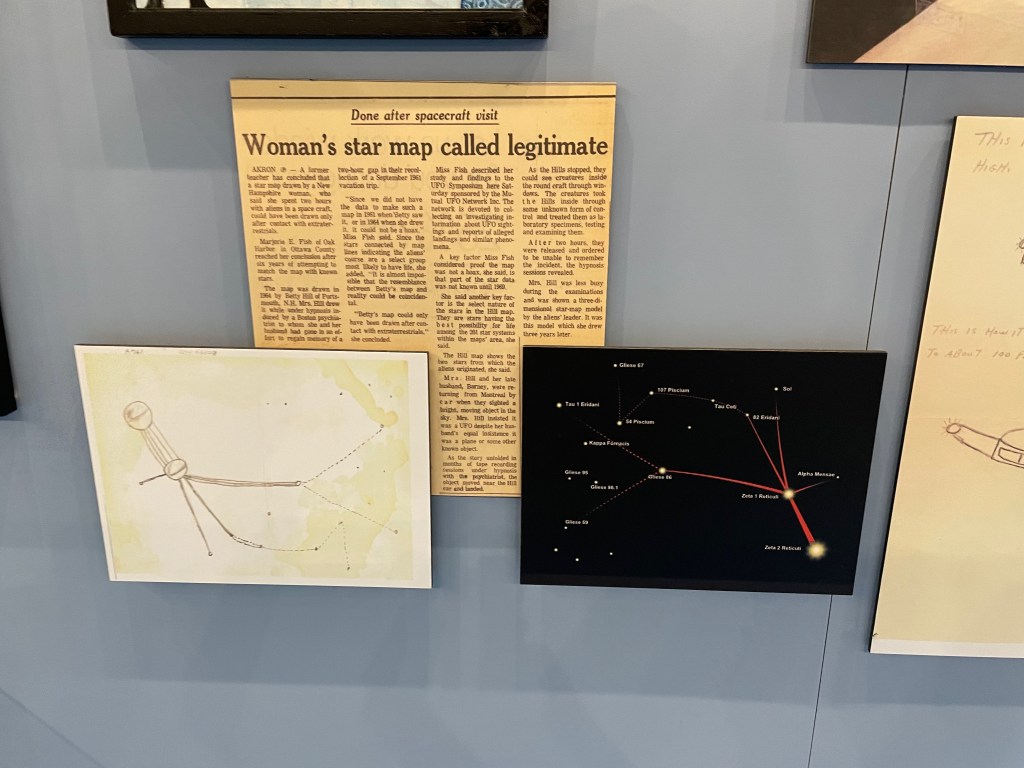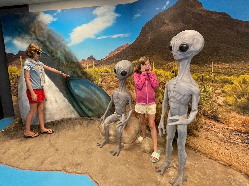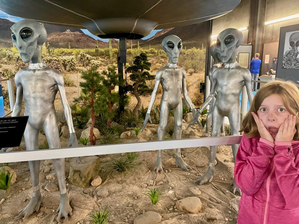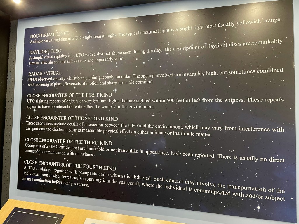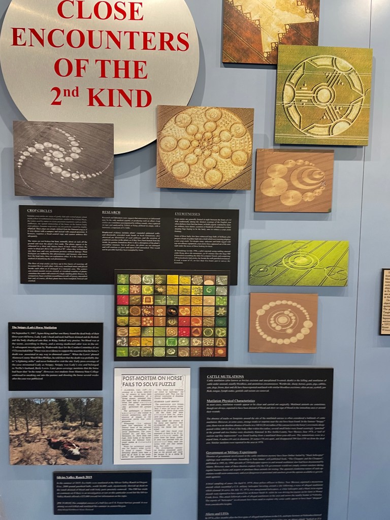Continue on and learn about the tons more reports of unexplained phenomenons and also the influence it’s had on pop culture and Hollywood. It wasn’t until we got to the exhibits describing the various types of alien encounters and the first hand accounts of abductions – including the Hill couple’s story from NH, that the kids started getting creeped out, LOL. It is funny that this NH story got such a large exhibit in this museum but is nearly unheard of in NH. Honestly, my only memory of this story is stopping in a gas station on the way to camp with lots of UFO articles posted all over it, but it certainly hasn’t attracted the touristy interest that Roswell has that’s for sure. I thought the videos about the crop circles all over the world were super fascinating. It was a fun and entertaining 2 hours.