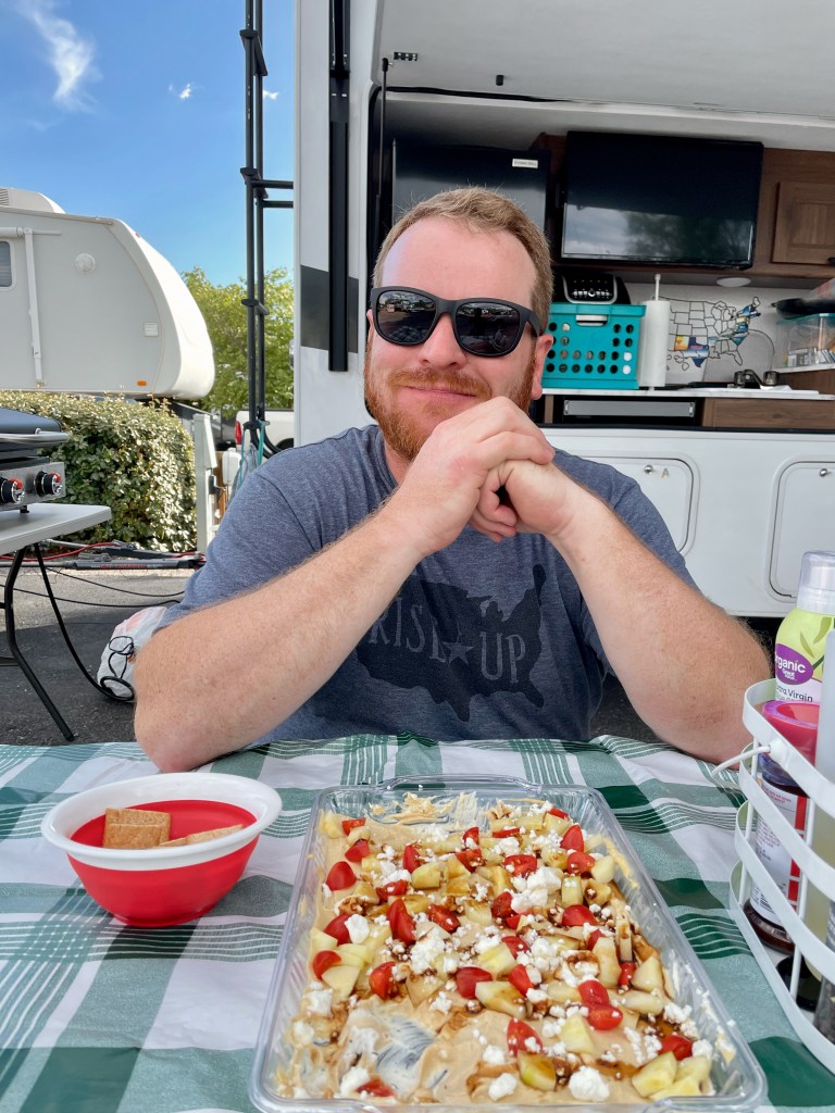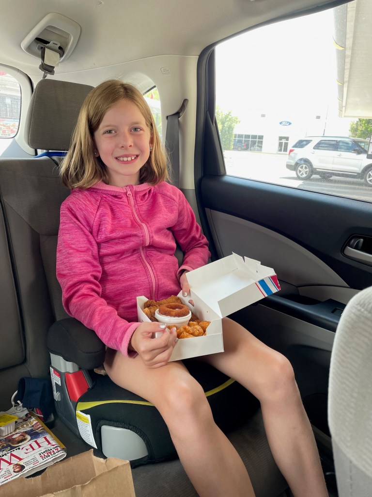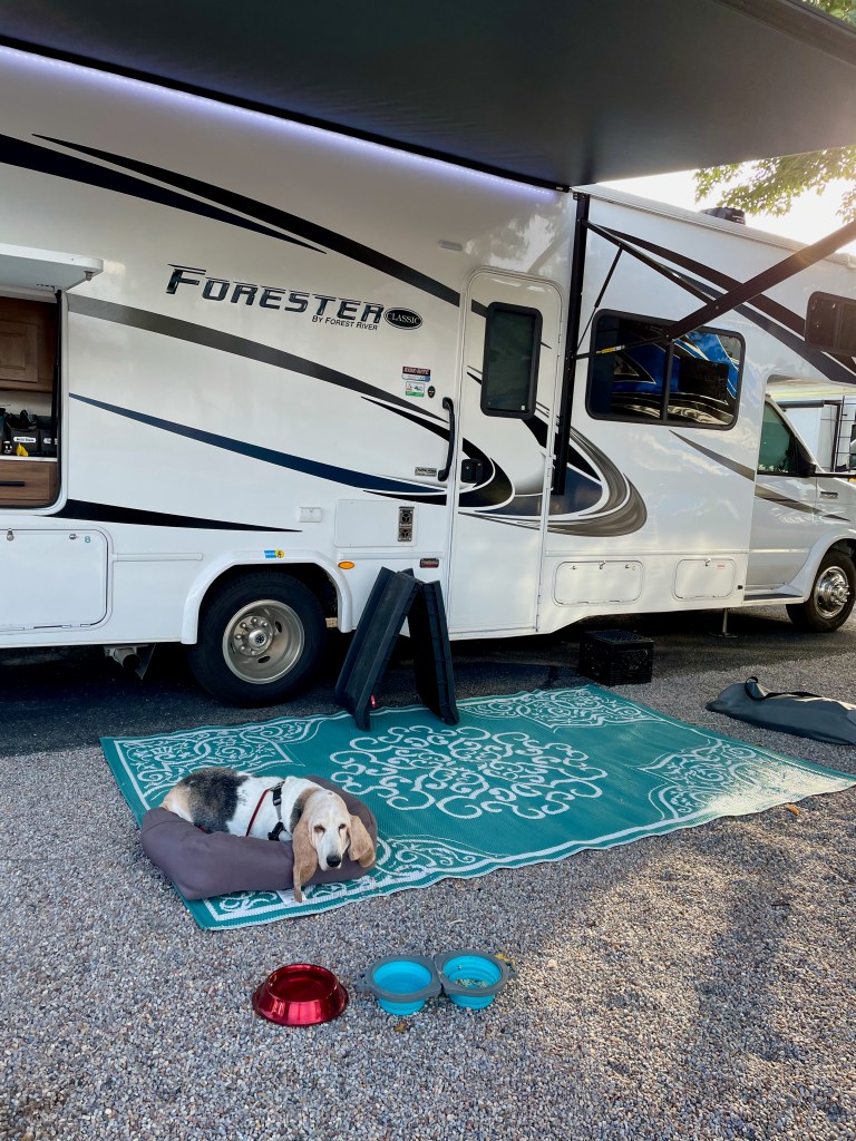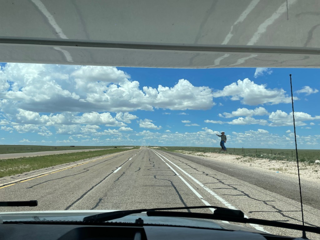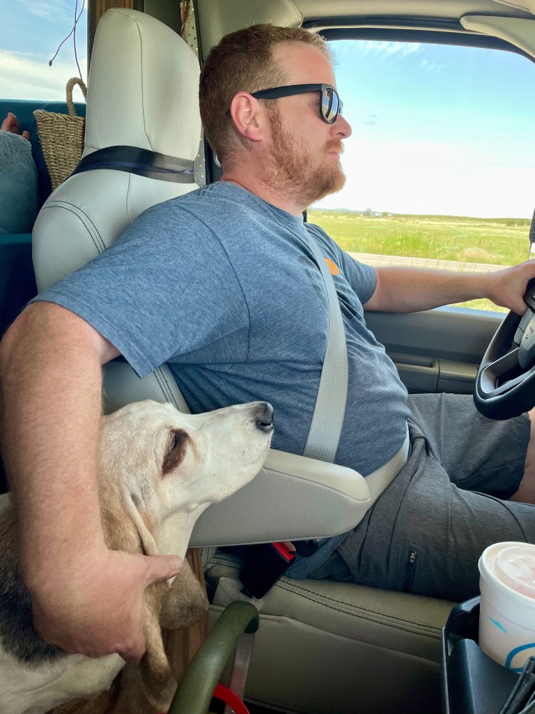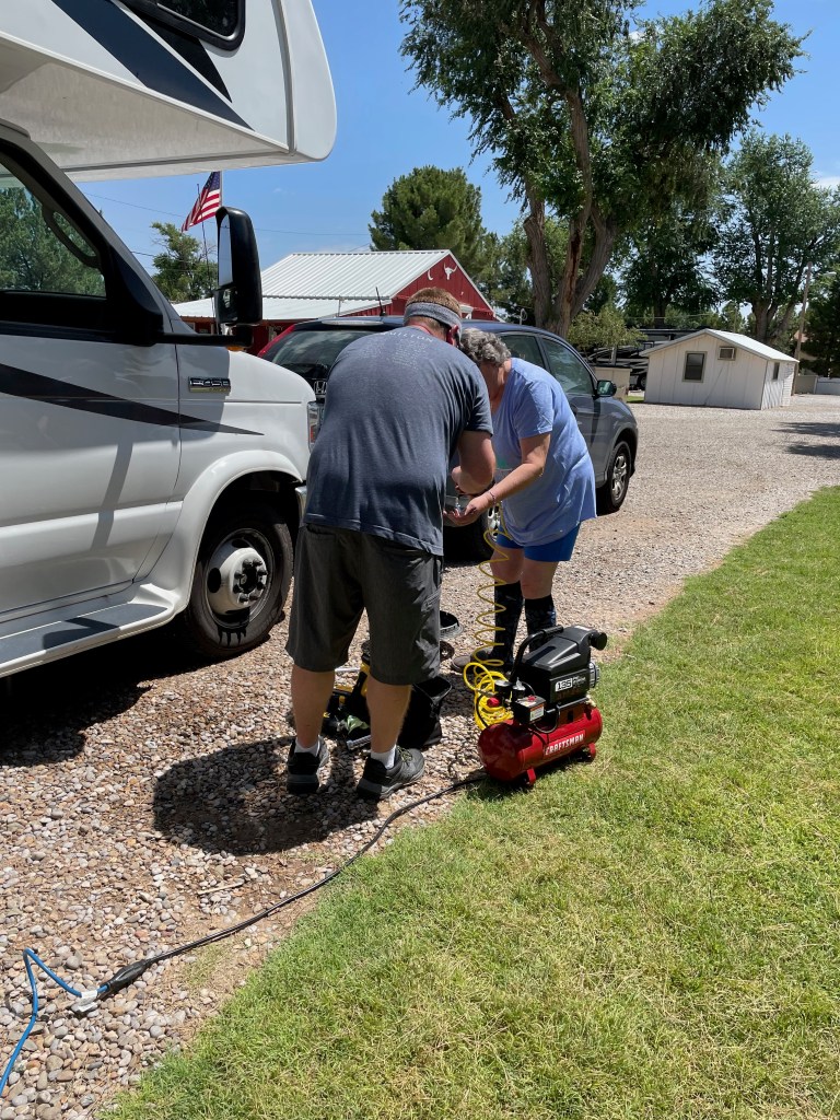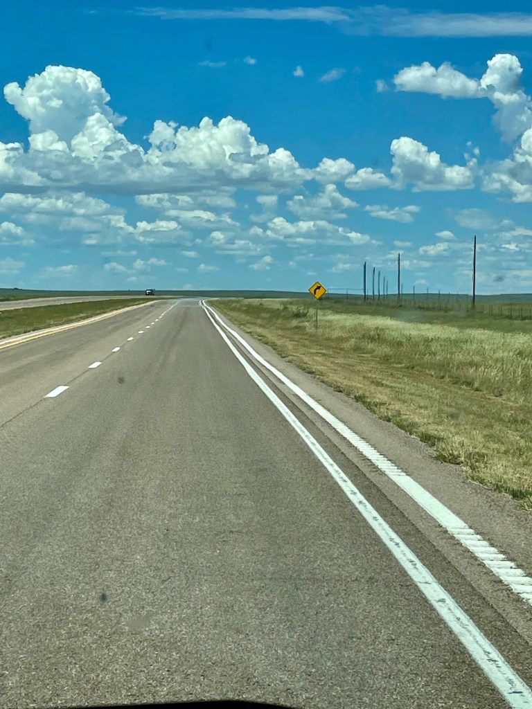 Kids had Sonic for the first time ever (and maybe last, not that memorable, and no more roller-skating). Then we packed up for Albuquerque. Our nice neighbor at the Red Barn RV Park loaned us their air compressor so Mat could take care of the tires. We have found most of our neighbors to be nothing but friendly. We did find the flat part of NM I remembered from my trip in the 90s. The road was so straight for so long that we took a picture when it finally turned. We arrived to a very pleasant KOA tucked right into the city of Albuquerque. We had a relaxing night of swimming, grilling, cards, even a load of laundry got done. We voted not to explore the city and enjoy camping tonight and tomorrow morning so that’s what we did. Also, Murphy seems to have an upset stomach, so we’re happy sticking close to the RV and hanging out with him.