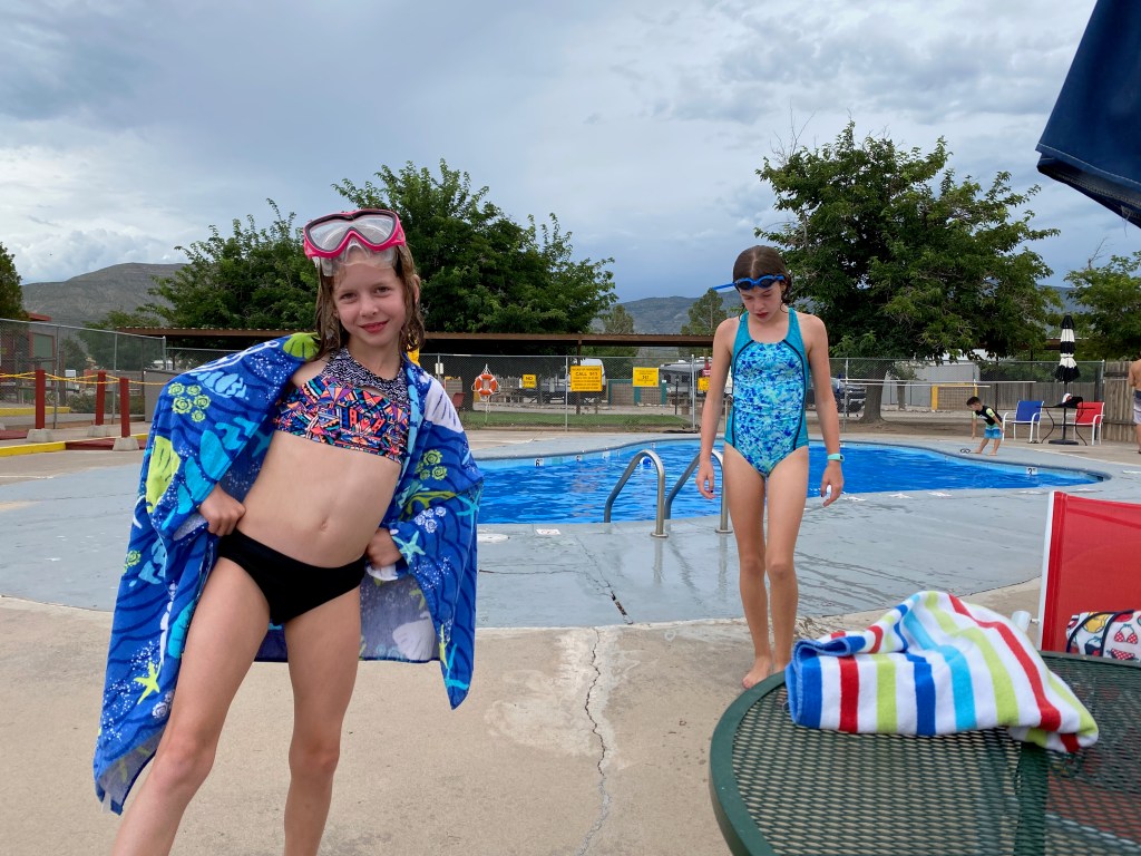 We were happy to be back at a KOA campground for the night with cleaner showers and a pool for the kids to jump in. The Whites City RV Park had no pool but it did have laundry so it was the first day on the trip I had dry towels! So far, every time I’ve done a wash the swim stuff is immediately used and wet again. While I enjoyed having clean towels for a couple days the wet ones don’t really bother me that much… it’s a part of camping you just accept. This whole trip has inherent discomforts, it’s like skiing – even the best days of skiing you know you’re going to be cold or wet or have an uncomfortable boot or have to deal with foggy goggles at some point but that never trumps the actual experience. We all LOVE a day of skiing and we are all LOVING camping life.