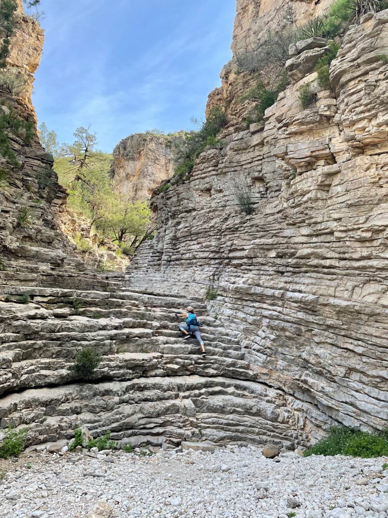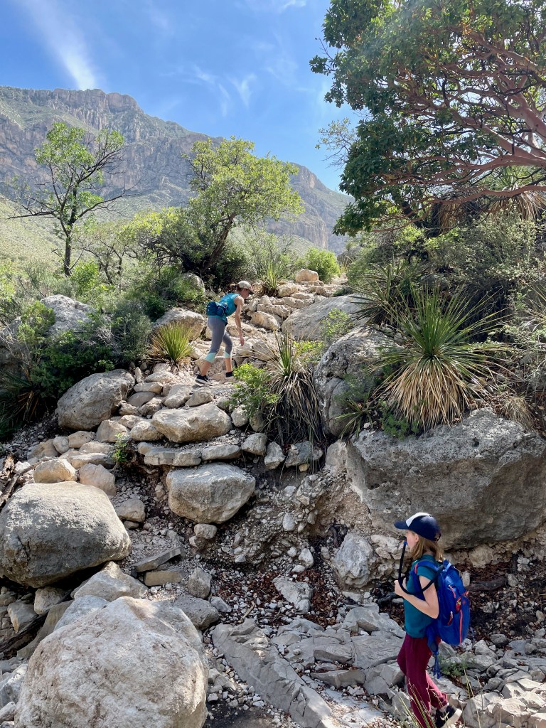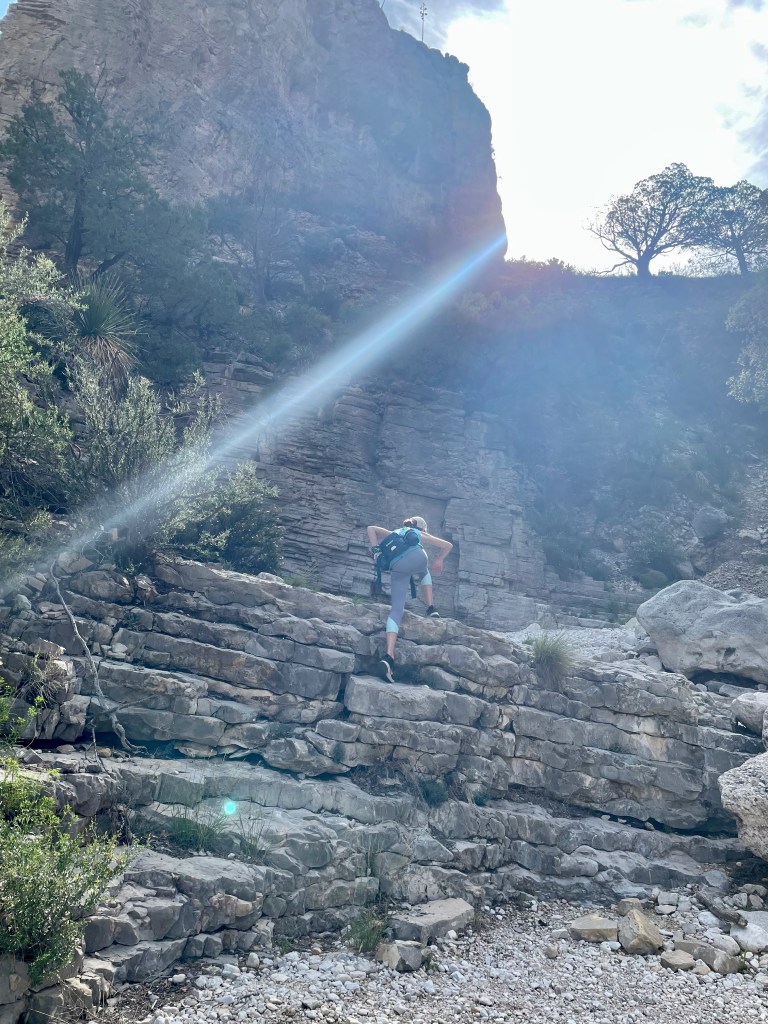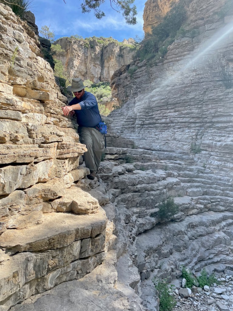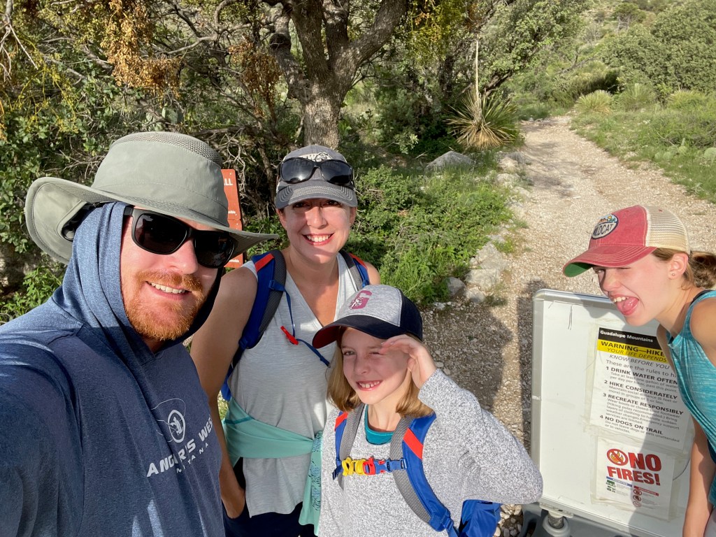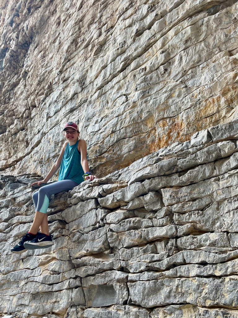 The trick to finding the fun: get up early before the heat (mornings are in the 70s here – perfect), pick a hike that you can talk your kids into (Guadalupe Peak’s 8+ mile hike to the highest peak in Texas will have to wait), know that there will be something along the way to capture their interest (thanks National Parks FB Group for tips and pictures of this hike). So that’s what we did – we hiked 2+ miles from the visitor center to Devil’s Hall. Loved it. And hiked the 2+ miles back out.