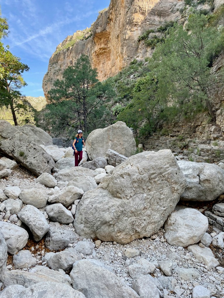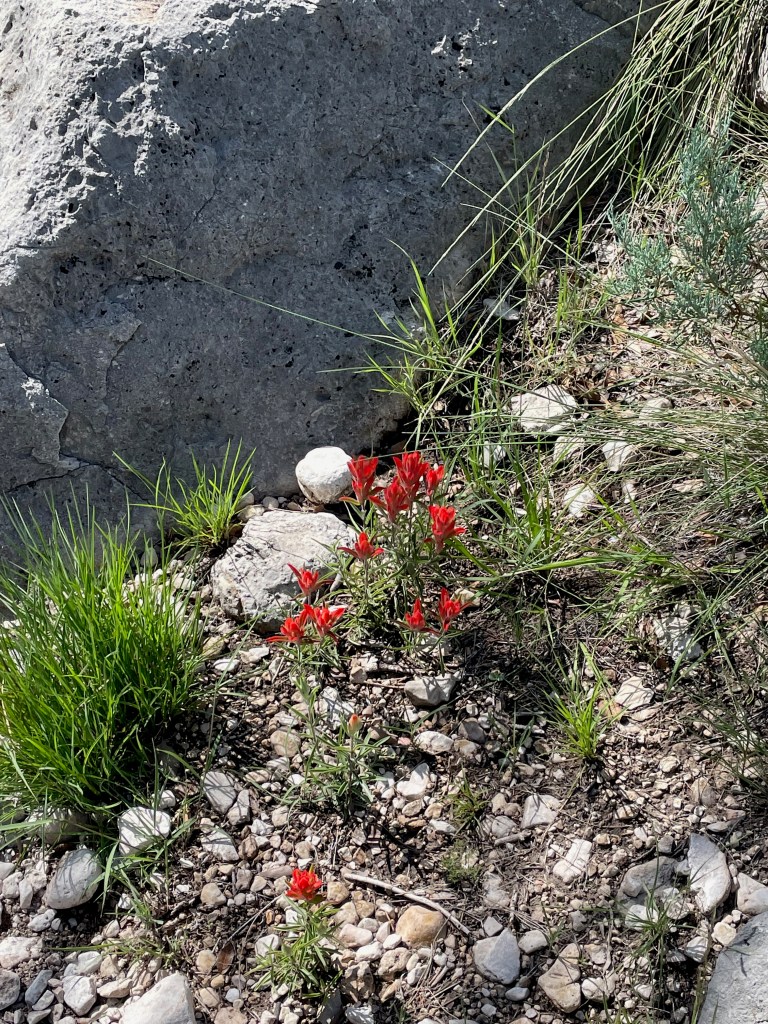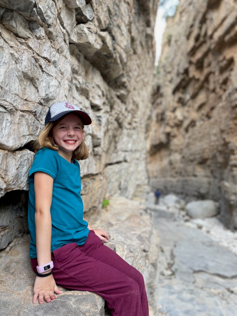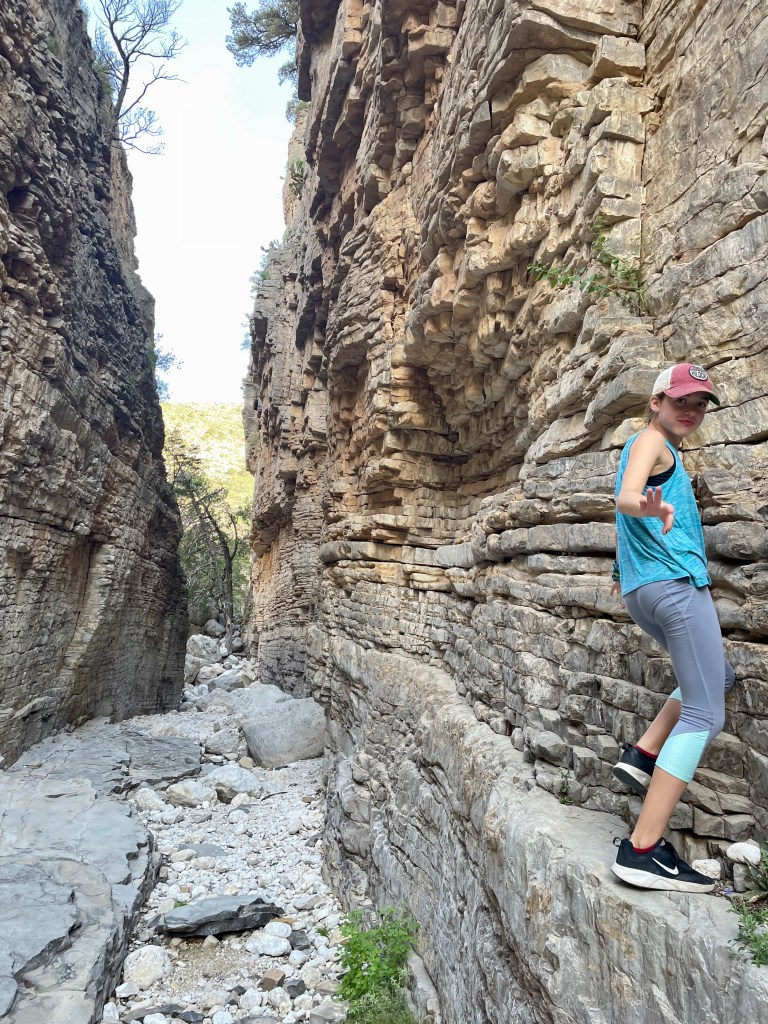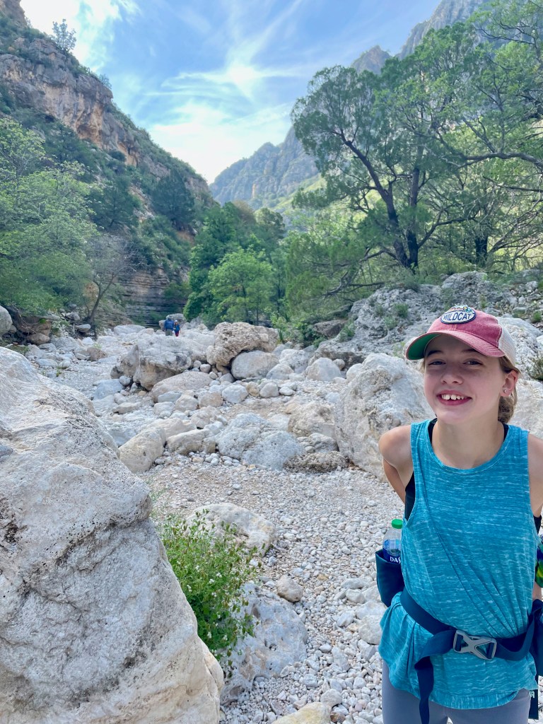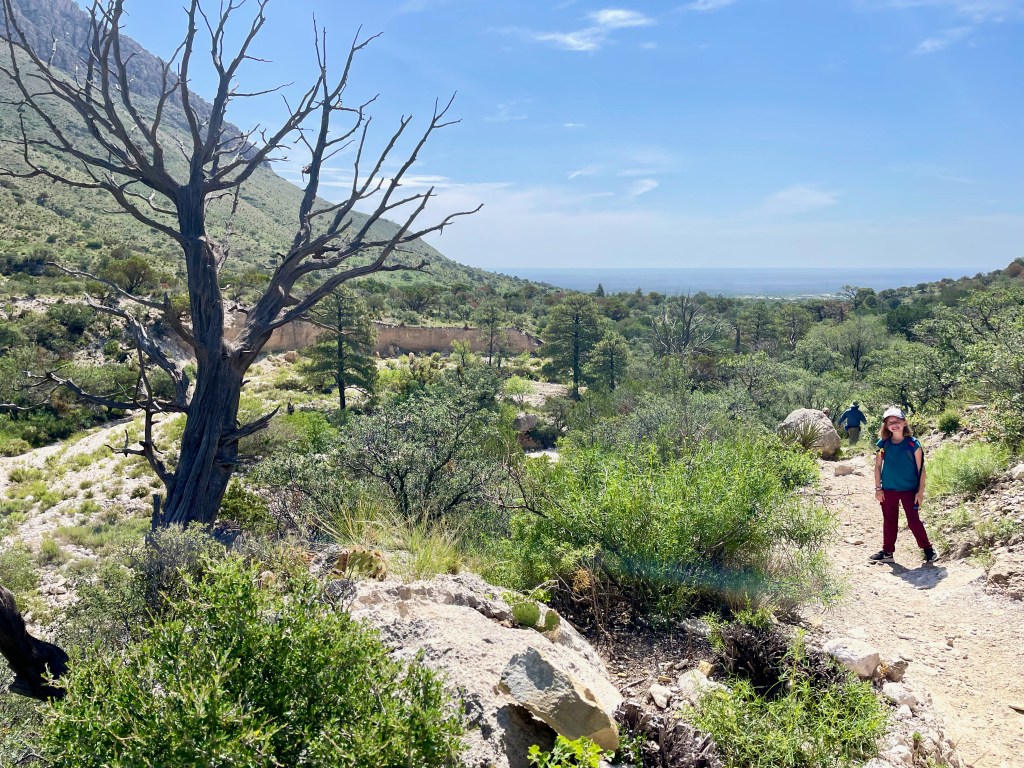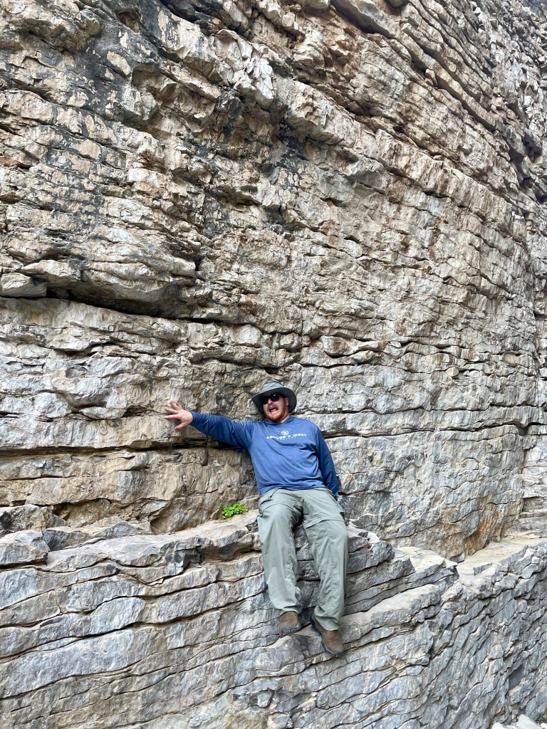 The trick to finding the fun: get up early before the heat (mornings are in the 70s here – perfect), pick a hike that you can talk your kids into (Guadalupe Peak’s 8+ mile hike to the highest peak in Texas will have to wait), know that there will be something along the way to capture their interest (thanks National Parks FB Group for tips and pictures of this hike). So that’s what we did – we hiked 2+ miles from the visitor center to Devil’s Hall. Loved it. And hiked the 2+ miles back out.