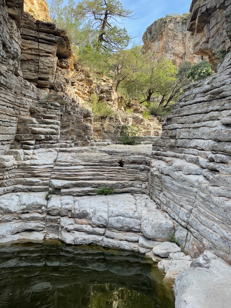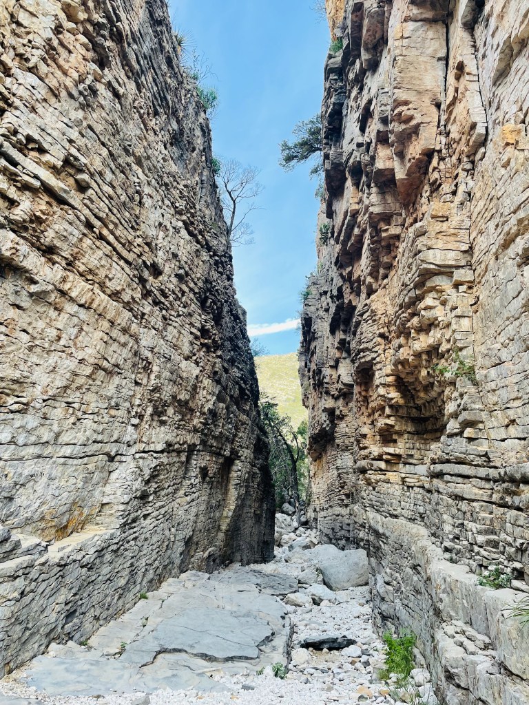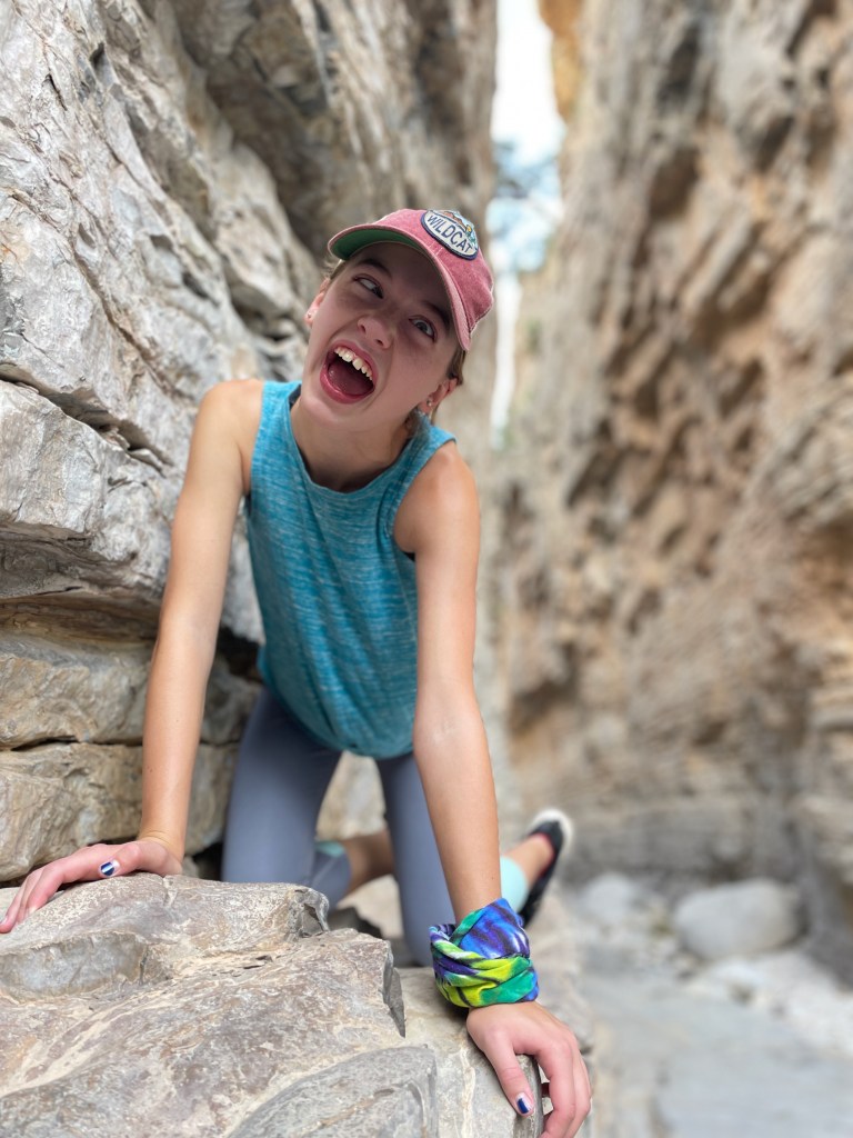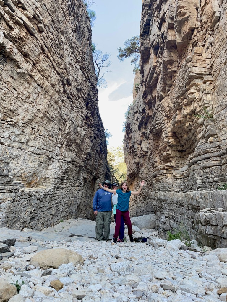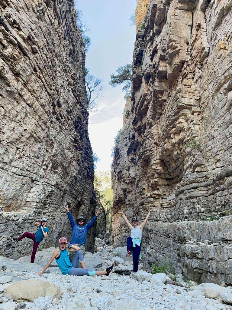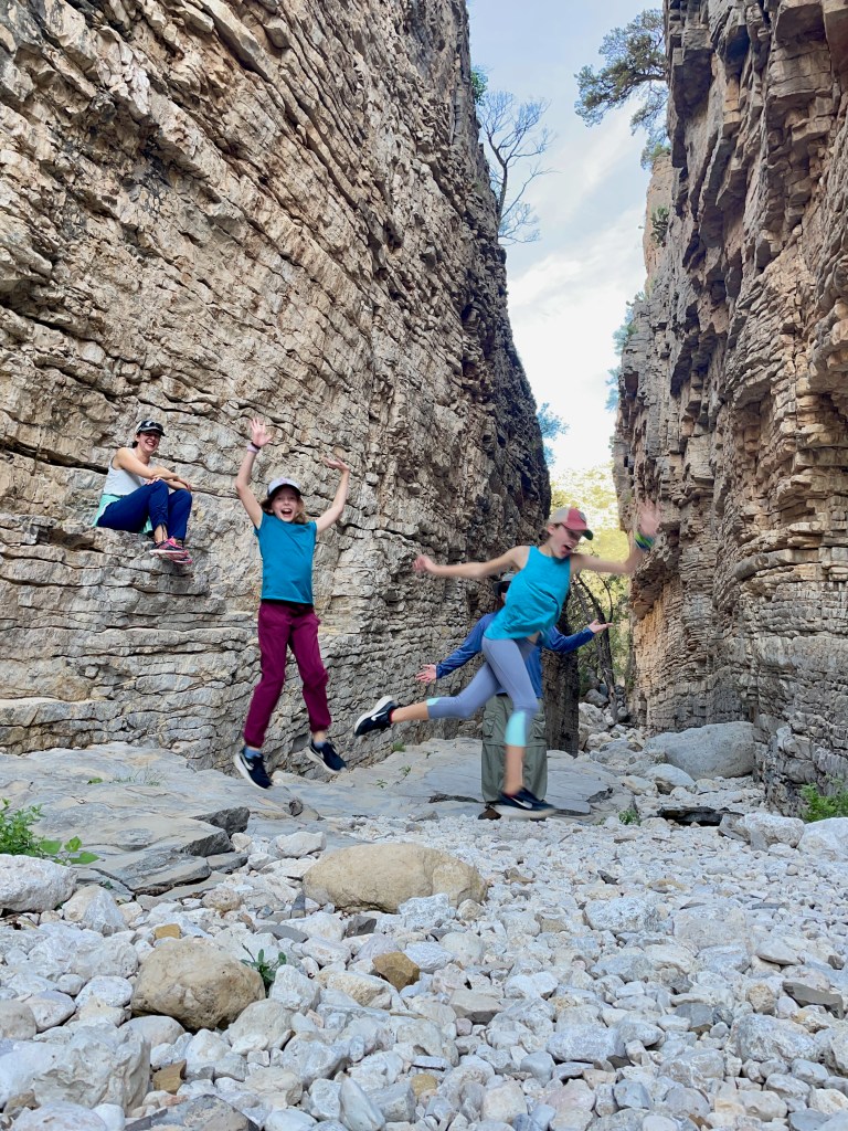 Instead of hiking up the Guadalupe mountains under the hot NM/TX sun, we hiked down into a canyon, followed a dry river bed that offered shade, climbed awesome rock formations nicked-named “the stairs”, and found the narrow canyon passage named Devil’s Hall that was actually more heavenly then hellish – cool and shaded this early in the morning! We rested, had snacks, spent time being silly, and took a bunch of photos. Once the kids start taking silly photos it’s hard to get them to stop. We had to remind them that outside our cool passage way the sun was only getting hotter so we finally said goodbye and headed back. On the return trail we saw a total of 6 people our entire morning in the park. Six. This park only sees 200k+ visitors a year compared to Great Smokey Mountains National Park’s 12 million+ visitors. It was kinda nice having the place to ourselves!