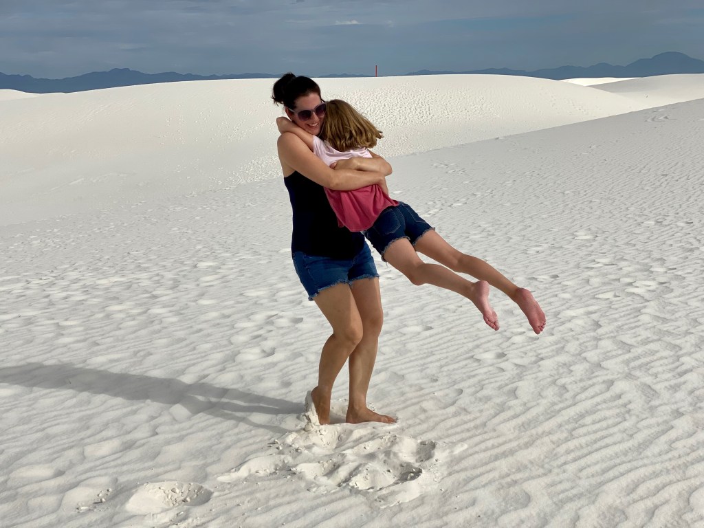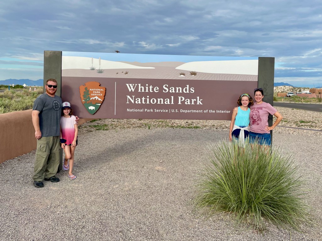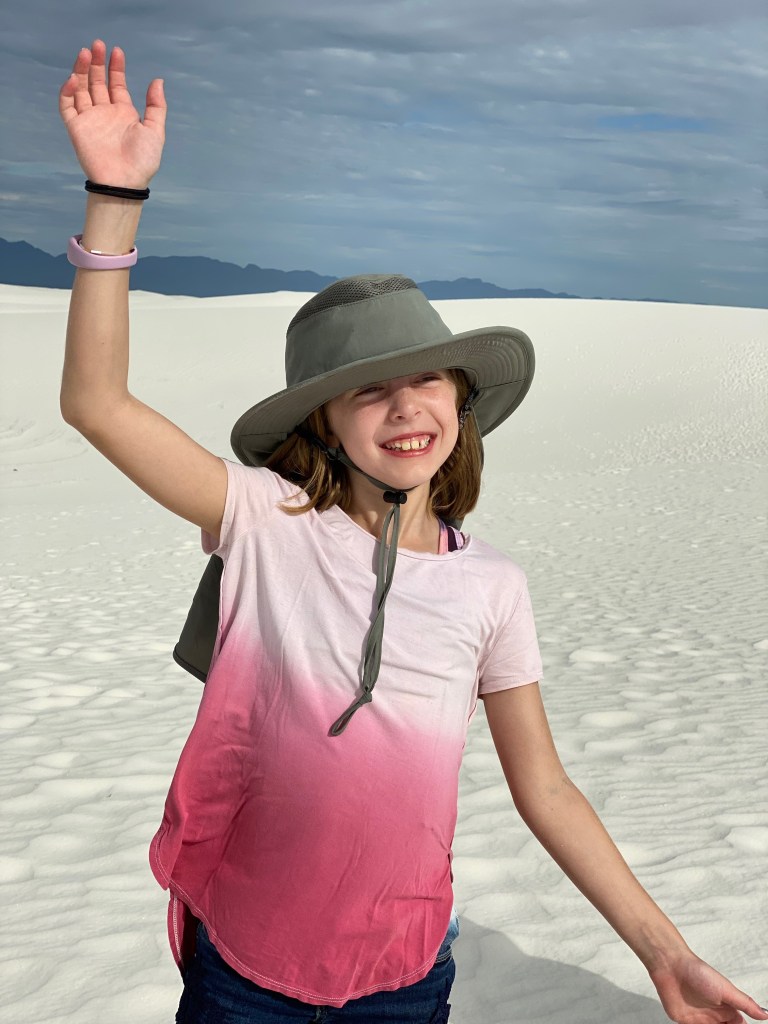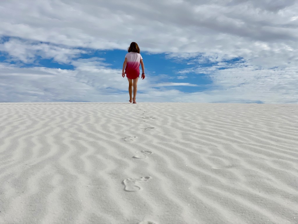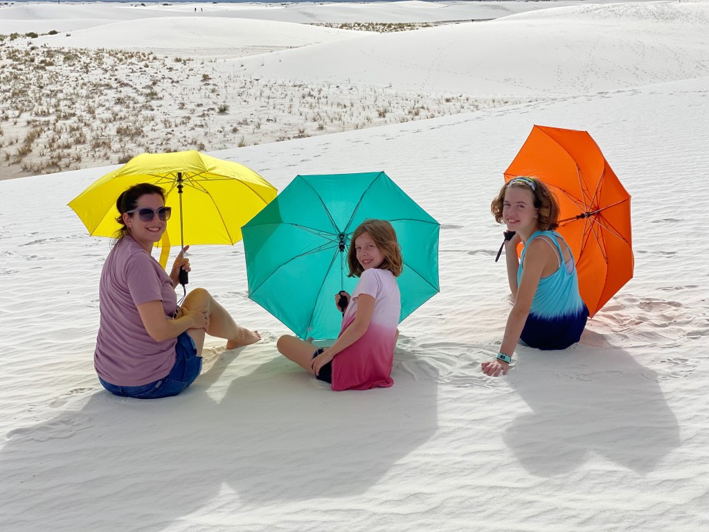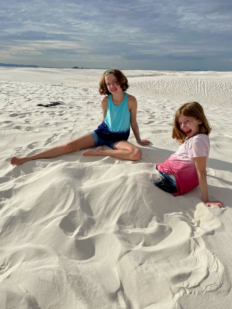 So my plans certainly don’t go exactly as planned and that’s okay. I had grand plans to get to White Sands National Park last night for sunset and again this morning for sunrise. But as we enjoyed our taco dinner last night we saw the sun beginning to set. We did try to get to the park after dinner, but it was already dark by the time we pulled up, oops. The sunset was still gorgeous from Peggy. I thought the kids were being surprisingly good sports about visiting a park during prime game time until they admitted they just wanted to hear more of our book, LOL. We’ve been reading Hunger Games together during the Peggy drives or downtime. It is a great book and something exciting always seems to be happening so I don’t blame them. As for sunrise, well, the sun rises at 6:15 and the park opens at 7 so we enjoyed our morning without a rush. But that’s not to say we still didn’t get there early. We all enjoy doing the fun stuff before the mid-day heat!