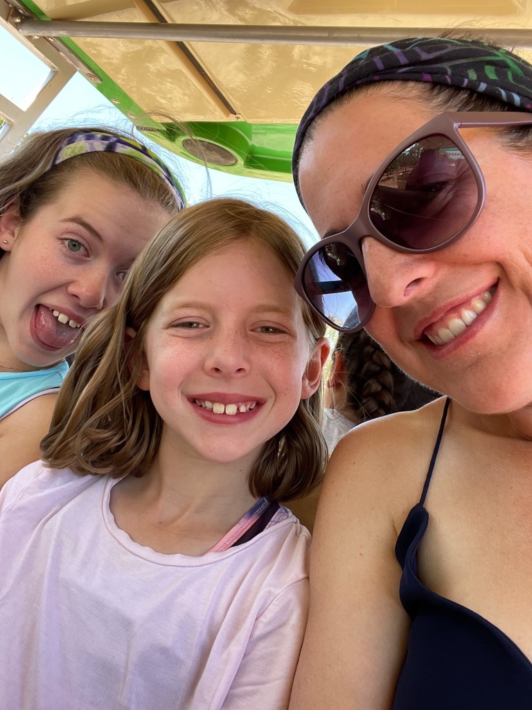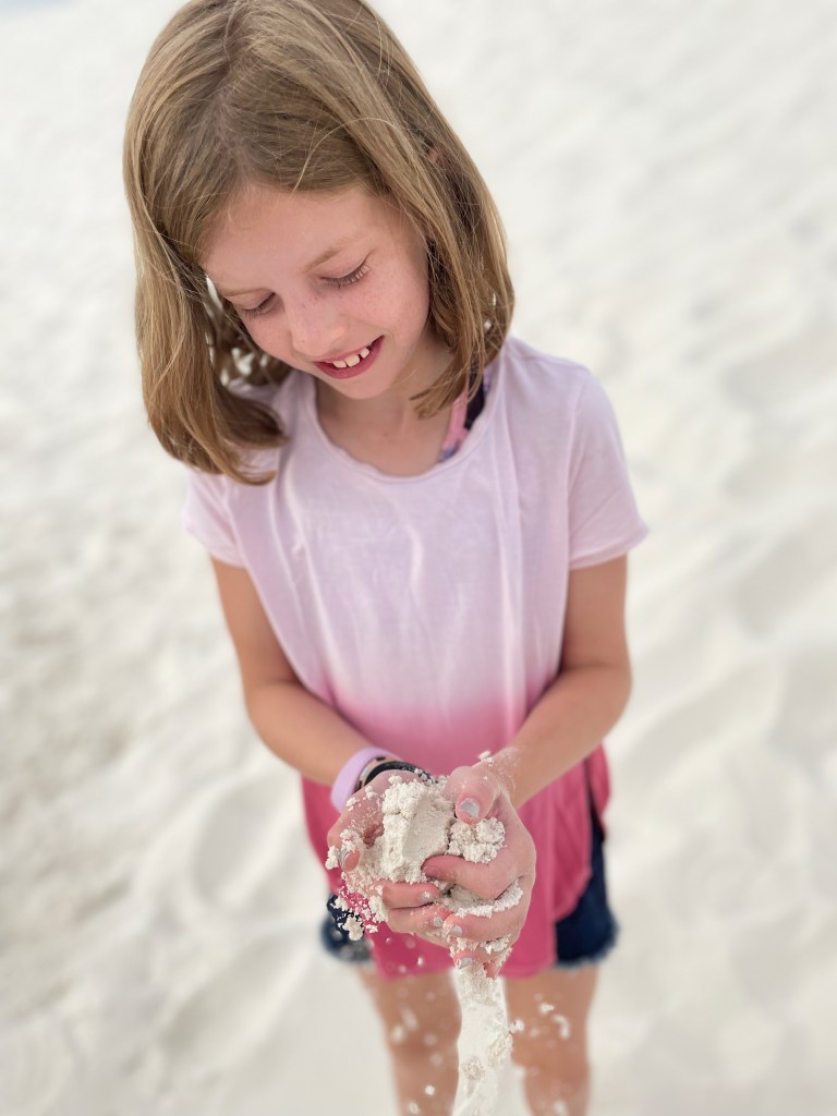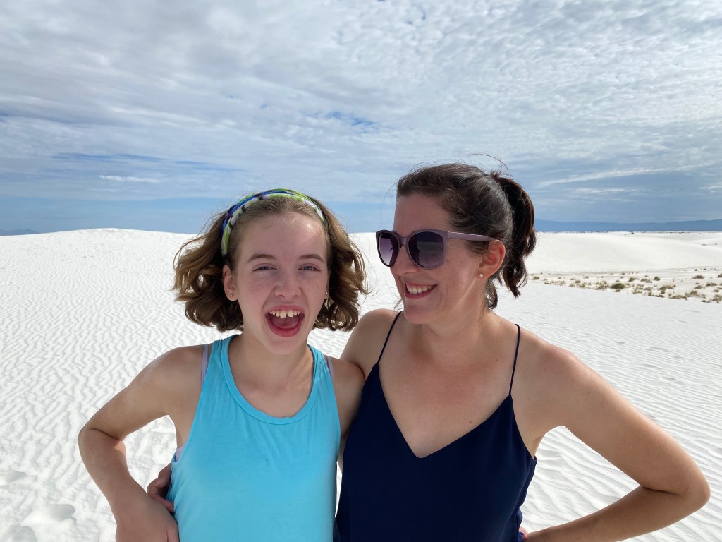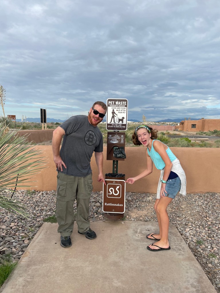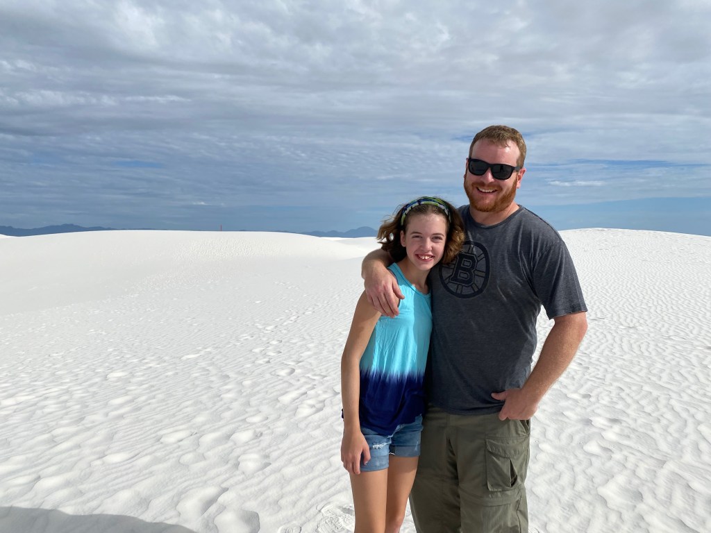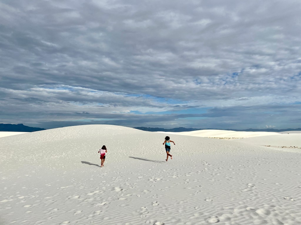So my plans certainly don’t go exactly as planned and that’s okay. I had grand plans to get to White Sands National Park last night for sunset and again this morning for sunrise. But as we enjoyed our taco dinner last night we saw the sun beginning to set. We did try to get to the park after dinner, but it was already dark by the time we pulled up, oops. The sunset was still gorgeous from Peggy. I thought the kids were being surprisingly good sports about visiting a park during prime game time until they admitted they just wanted to hear more of our book, LOL. We’ve been reading Hunger Games together during the Peggy drives or downtime. It is a great book and something exciting always seems to be happening so I don’t blame them. As for sunrise, well, the sun rises at 6:15 and the park opens at 7 so we enjoyed our morning without a rush. But that’s not to say we still didn’t get there early. We all enjoy doing the fun stuff before the mid-day heat!
