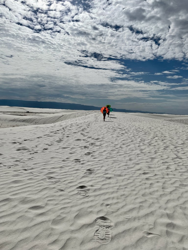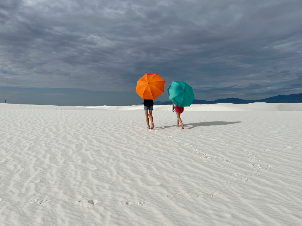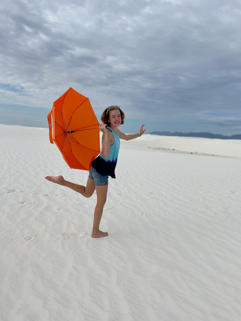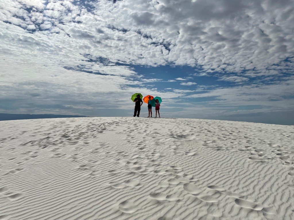 We started the day in the dunes playing football, running around, playing frisbee, rolling down hills, climbing over more and more dunes. I did keep the camera out of the fine sand while we played but definitely took tons of pictures as the day went on. I hiked back to the car for umbrellas, so we lasted longer as it got sunnier out… and the umbrellas turned out to be fun props for the kids (thinking of Ms. Debbie!). The dunes themselves don’t get that hot. The gypsum doesn’t absorb the sun. We learned this is the wettest desert with a collection of water under the dunes that keeps them cool, even damp underneath which also keeps them from blowing away. But that didn’t keep us from getting hot! So by mid-day we ventured back to the visitor center to learn more and earn the Jr. Ranger badge.