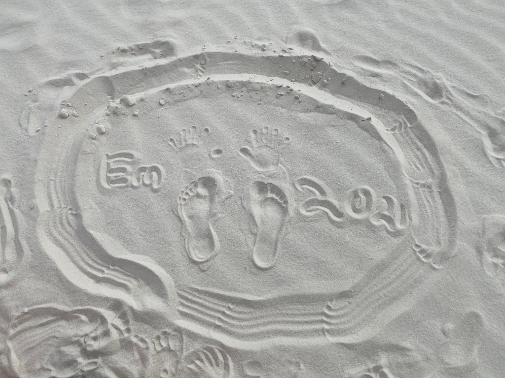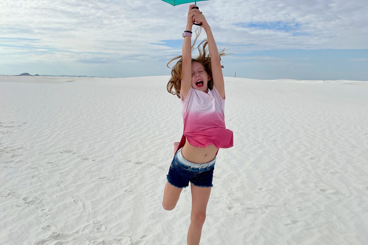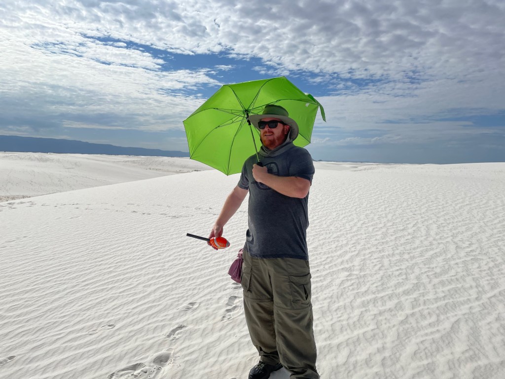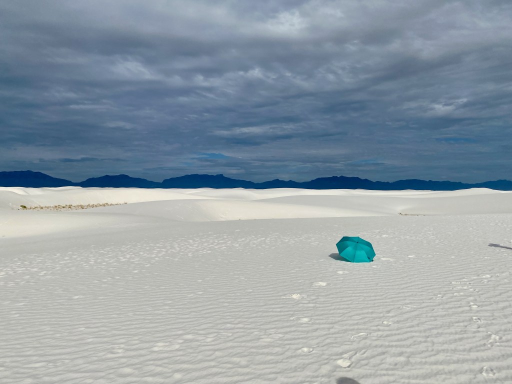 We started the day in the dunes playing football, running around, playing frisbee, rolling down hills, climbing over more and more dunes. I did keep the camera out of the fine sand while we played but definitely took tons of pictures as the day went on. I hiked back to the car for umbrellas, so we lasted longer as it got sunnier out… and the umbrellas turned out to be fun props for the kids (thinking of Ms. Debbie!). The dunes themselves don’t get that hot. The gypsum doesn’t absorb the sun. We learned this is the wettest desert with a collection of water under the dunes that keeps them cool, even damp underneath which also keeps them from blowing away. But that didn’t keep us from getting hot! So by mid-day we ventured back to the visitor center to learn more and earn the Jr. Ranger badge.