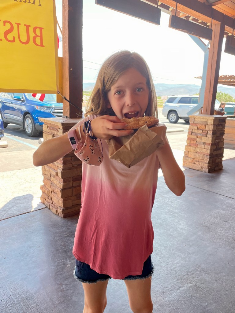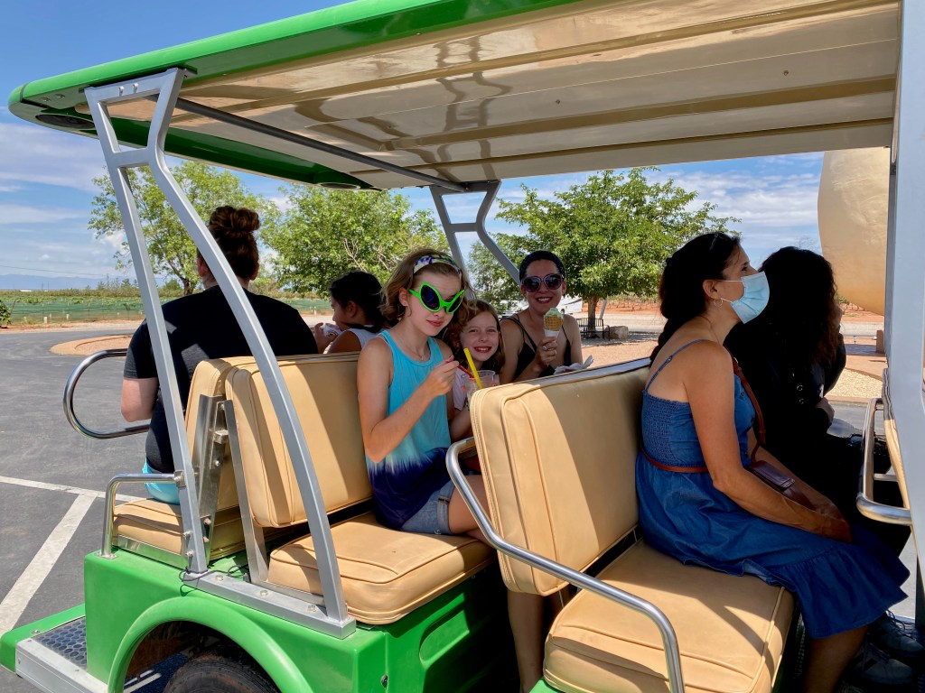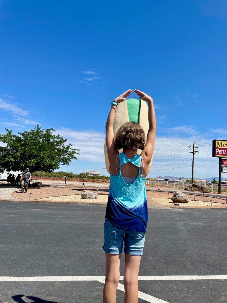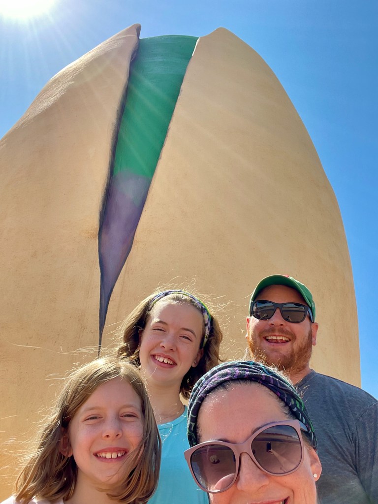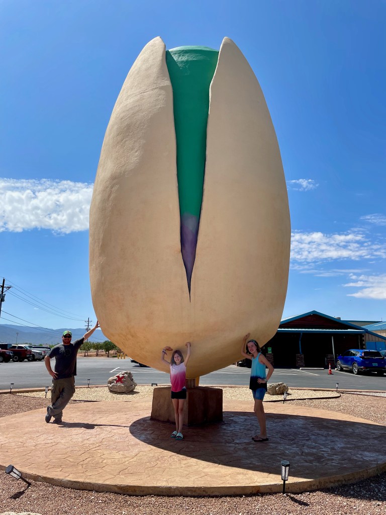 Next stop: PistachioLand! I wanted to see the “world’s largest pistachio nut” because it’s been awhile since I’ve had my fill of concrete foods. Turns out it’s not just a roadside attraction — it’s a full-on tourist trap and we loved it! We tried the pistachio ice cream, we bought various flavors of pistachios that are all grown, processed, seasoned and packaged right there on site — so good! We even took the tour through the orchard and learned all about the farming of pistachios which was really quite interesting! The giant pistachio sculpture was in honor of their dad who started the farm and also loved putting his family in car to seek out similar roadside attractions. I thought it was a son’s sweet tribute to his dad, so I’ve requested the same from my girls – a roadside attraction in my honor when I die. Maybe giant ski poles on route 26 in Upton, LOL.