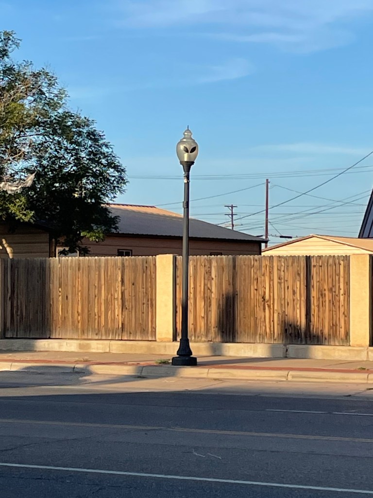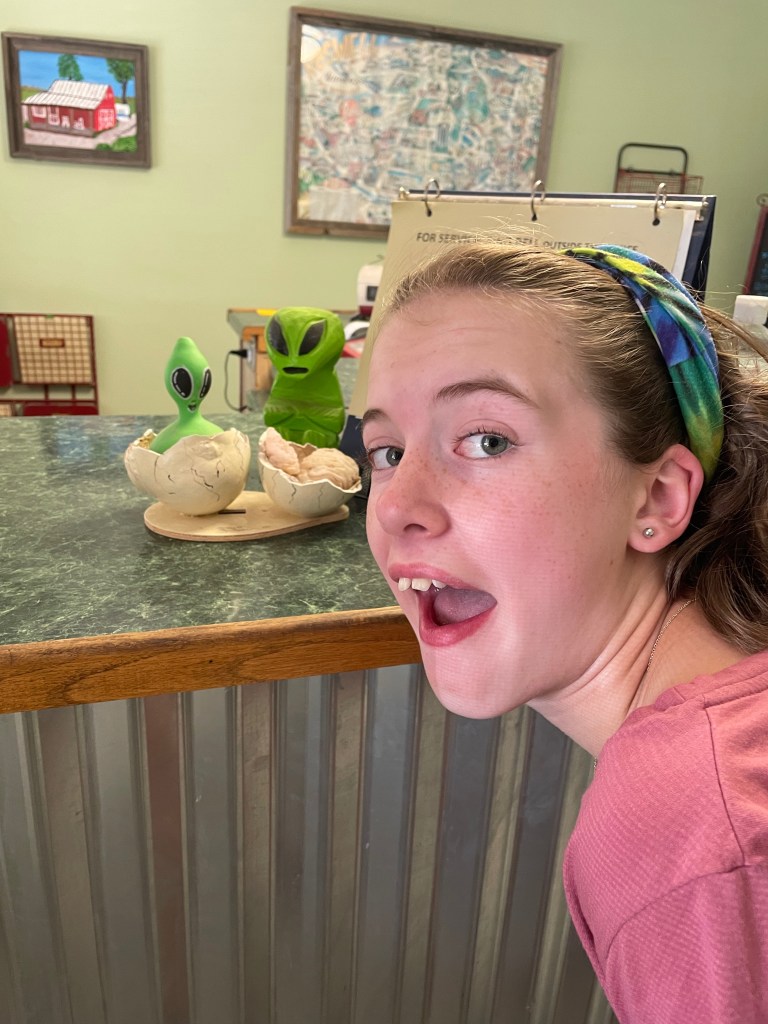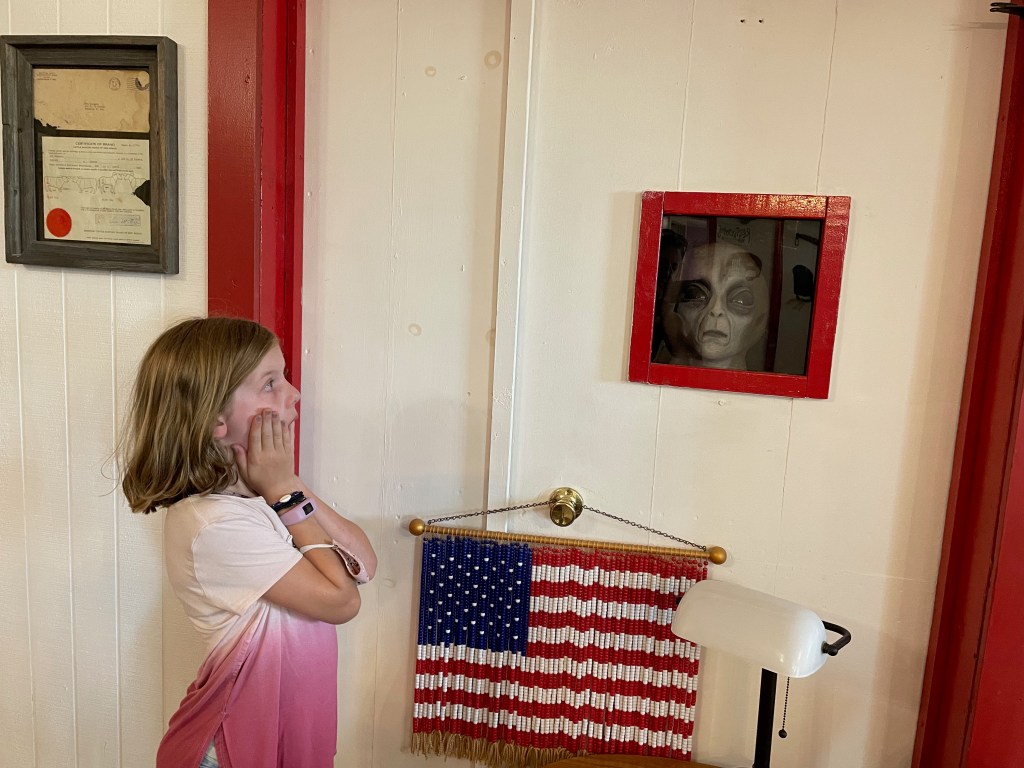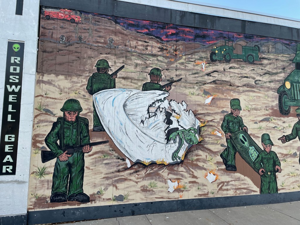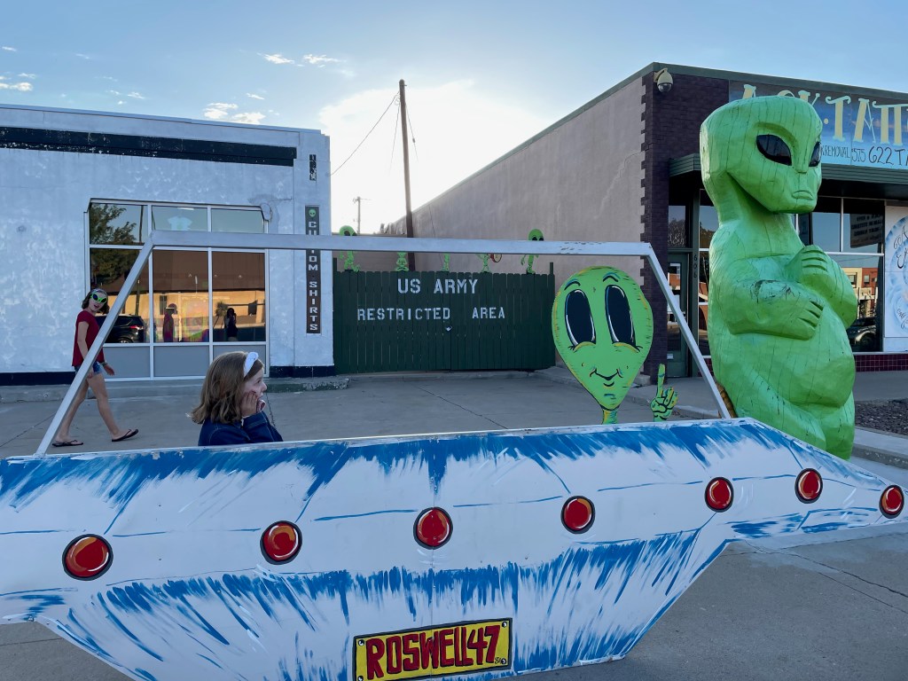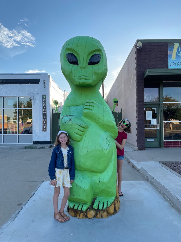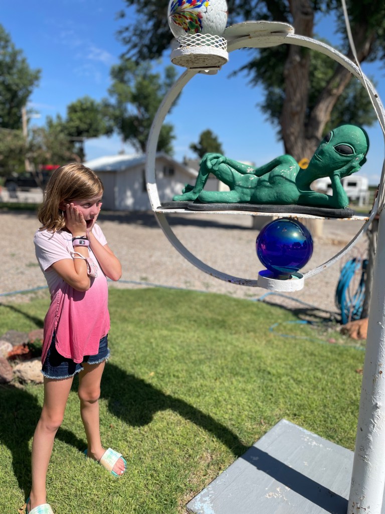 After our nutty stop we drove from Alamogordo to Roswell, NM and the alien sightings started immediately and never stopped. Even their Dunkin Donuts has a massive alien out front! We stayed at the Red Barn RV Park and found it was a surprisingly charming spot just outside a fairly tacky town. Luckily we like charming and tacky! So we went out to dinner for the first time since Pigeon Forge (which feels like a lifetime ago) just to explore the downtown a little more.