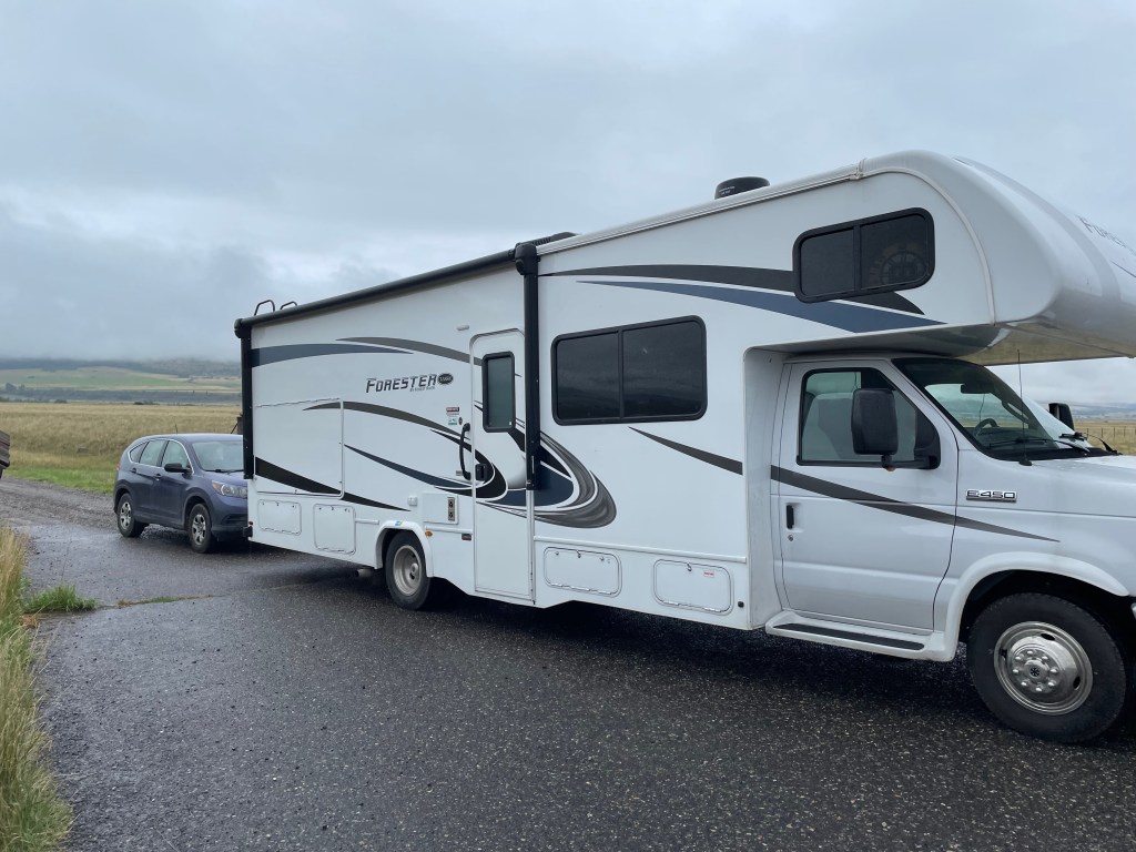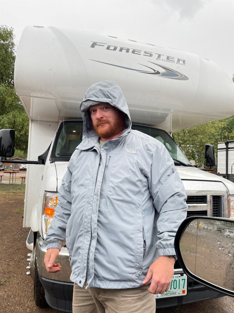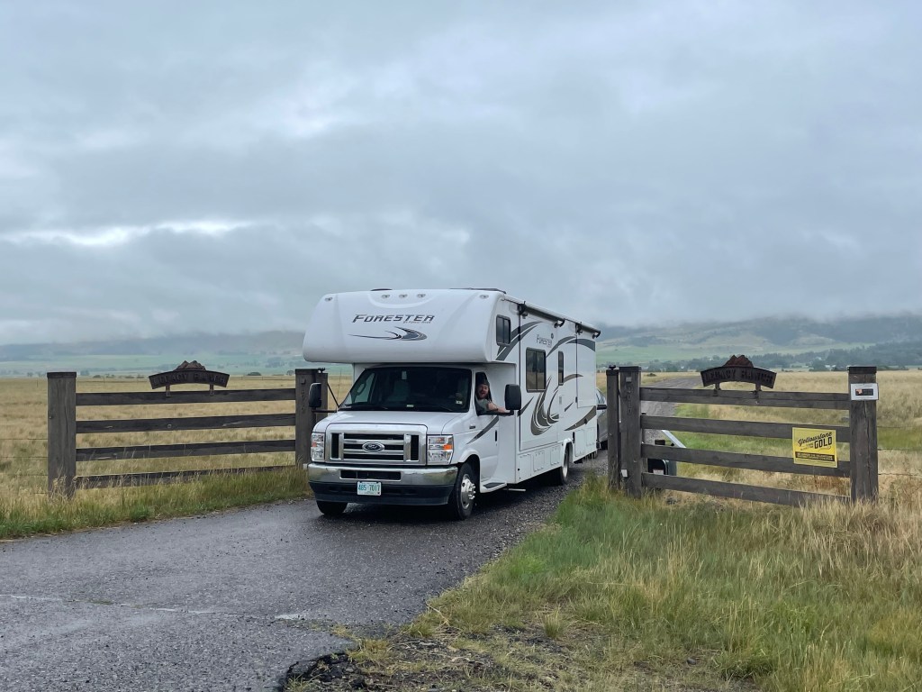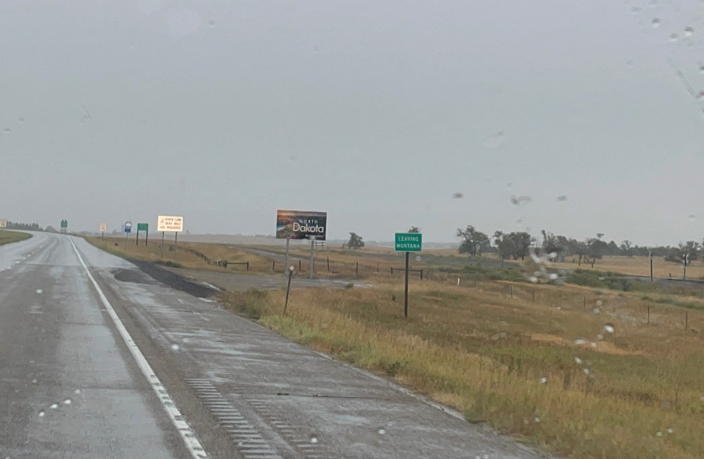 We are packed up and headed to Medora, ND — 412 miles from the ranch. We are breaking our 300 mile self-imposed limit but there is not tons between here and there that tempts us to stop. In fact, there is almost nothing. We did pass Pompey’s Pillar National Monument that is a huge rock that Capt. William Clark signed his name on as he passed by on his quest west, we did not stop. Mat said the drive was easy with no traffic, nice roads and didn’t even mind the light rain most of the day. We’ve been pretty lucky with weather so far getting the worst of it during the nights. But tomorrow, our day to explore Theodore Roosevelt National Park, it is 100% chance of rain. We plan to get wet.