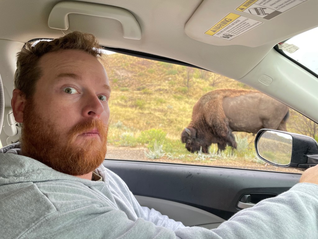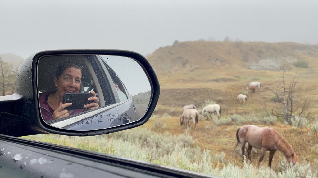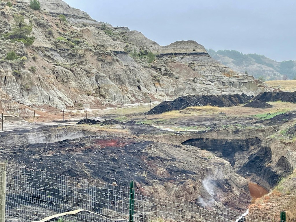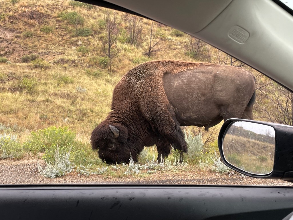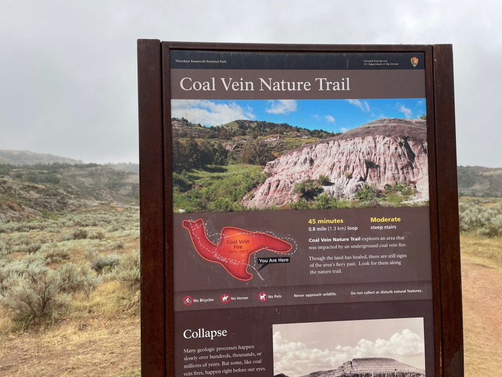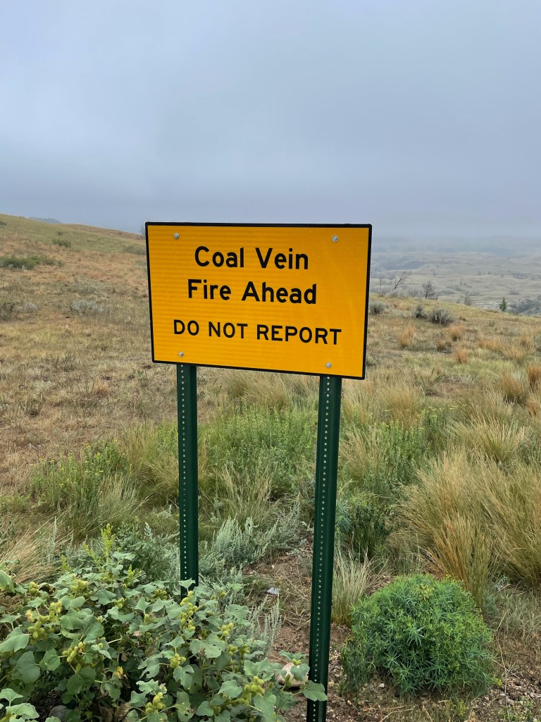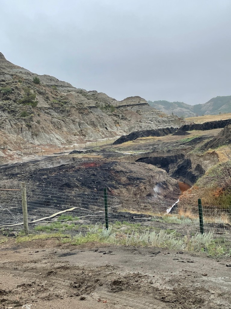 Next best thing in this park: the wildlife – WILD HORSES! I’ve never seen wild horses before and I was thrilled to find 2 different herds grazing in these bad lands. We also saw TONS of bison which is really cool up close from the safety of our car. There are only a few hikes in this park that cross the land and given the bison, wild horses, rattlesnakes, black widow spiders, 100+ summer temps… I was happy sticking to the scenic drive and mini hikes. The only animal we were sad to miss were the hundreds of prairie dogs who live together in “prairie towns”. Apparently they don’t like coming out on cloudy days because they can’t see their predators (birds) as well. Another cool park feature was the burning coal veins, you don’t see that everyday. One coal seam burned here for 26 years!