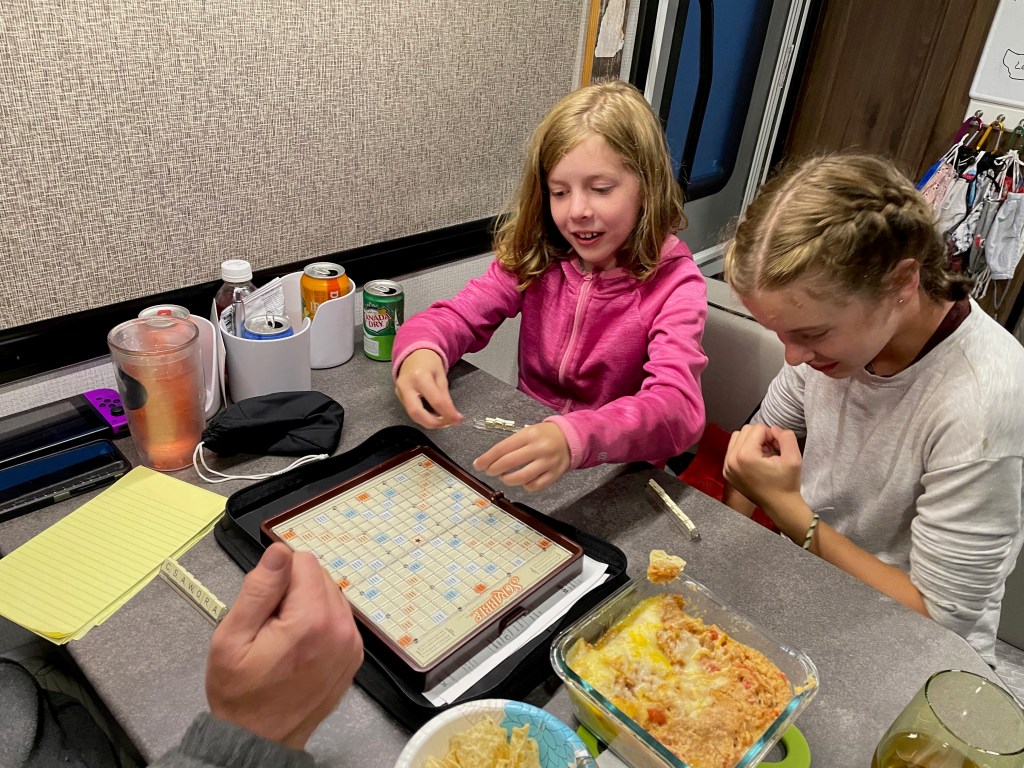 Lastly, (today was a long drive so lots of time to reflect and knowing our trip is coming to end soon I don’t want to forget any of it!) we found all the people in North Dakota. Were they at the national park? Nope. They were all in the parking lot of the Burning Hills Amphitheater (which seats almost 3000 people!) waiting to find out if the show was rained out. The Medora Musical only cancels shows AT show time, never before, and they ONLY announce it in person, not posted anywhere online. I have to give my family credit, they bundled up for cold weather, wind and light rain and humored me all the way to the show. Which was cancelled. They say they only cancel 3-5 times a summer on average so I am having my first regrets of the trip. Maybe regret is too strong a word, but if I had realized what a spectacle the show was going to be (horse on stage, fireworks, various dance troupes) AND considered how bad the weather was going to be today, I just may have rushed to the show last night when we arrived. But I’m out of planning shape after our 2 week hiatus, and also missed a magic show which would have been great on a rainy day. Mat loves a good magic show, and who knew Medora was going to offer so much entertainment? So we played our first game Scrabble which was fun too.