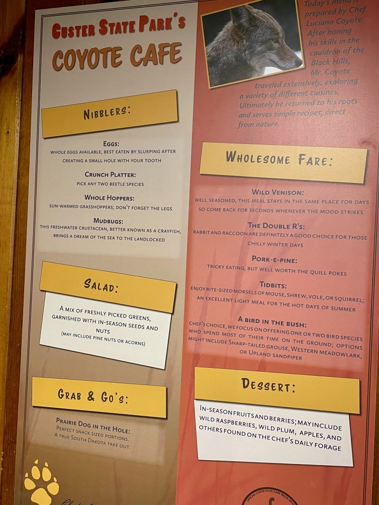We made our way to Hill City passing nothing but beautiful landscapes and one touristy stops after another: mini golf, beer garden, glow mini golf, zip line, chuck wagon dinner specials… we arrived at Palmer Gulch Resort KOA and it’s huge and pretty fun looking. The amenities seem top notch: pools, playgrounds, jumping pillow, tons of rec space, lots of OHVs to rent, even a Tap Room and place called “Grounds and Grapes” – sounds inviting. We get to our camp site, seems far from everything. Maybe that’s good, this place is almost too crowded for comfort. No cell service and no internet. I don’t think I’m going to like that since I have to check into flights tomorrow. We’ll figure that out later.