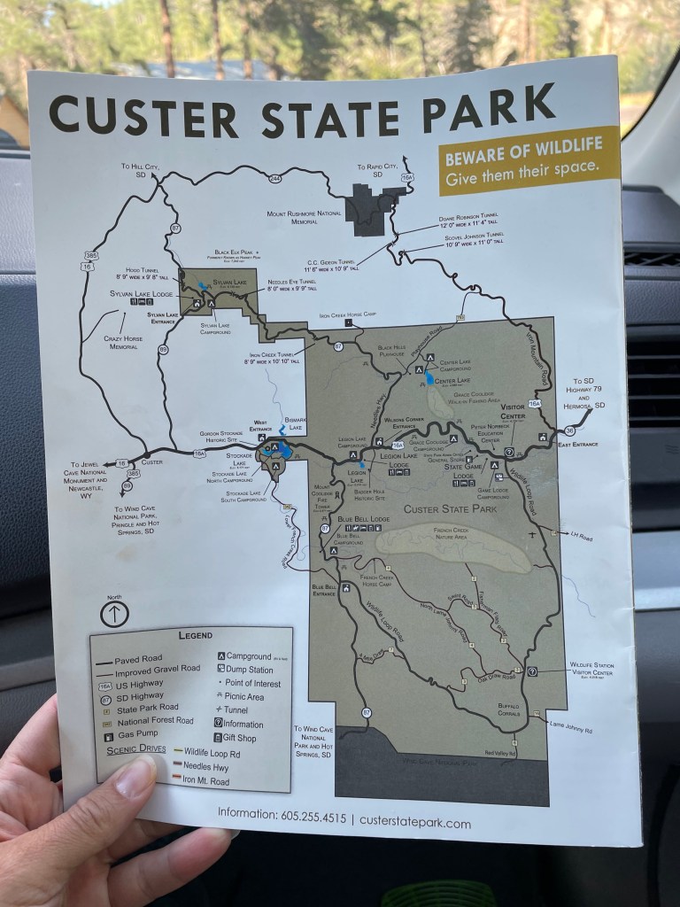 Along the drive, Maddy had a moment of cell and WiFi just long enough to learn her school posted her classes. She was dying to find out which of her friends were in her class, but just as quick as she got service she lost it. So she enjoyed Needles Highway less than the rest of us. Very frustrated by technology and getting excited for school. We get it. Back at the campground was no better for her. I also found the no cell/internet frustrating and had to go to the campground concierge (I told you, fancy) to get directions and timing to Mount Rushmore’s evening ceremony. Ready to go with paper map in hand, old fashioned style.