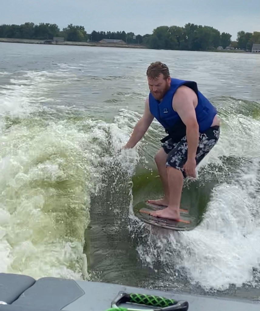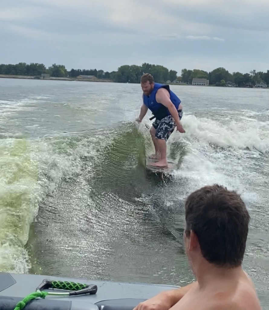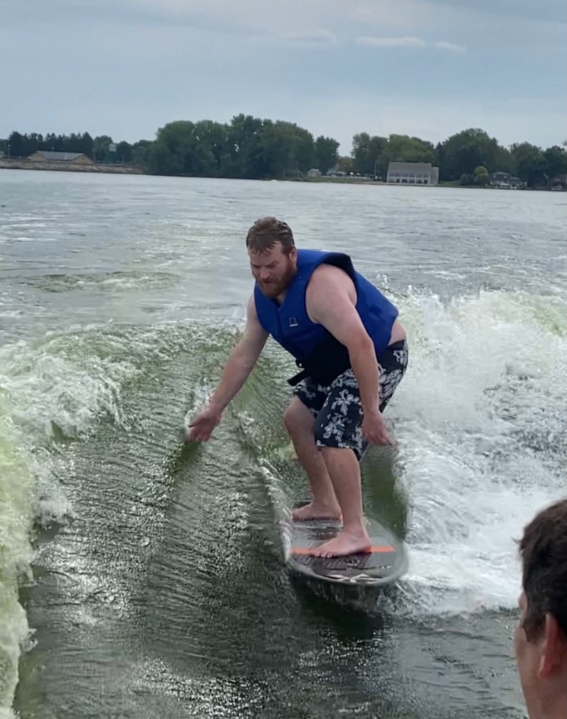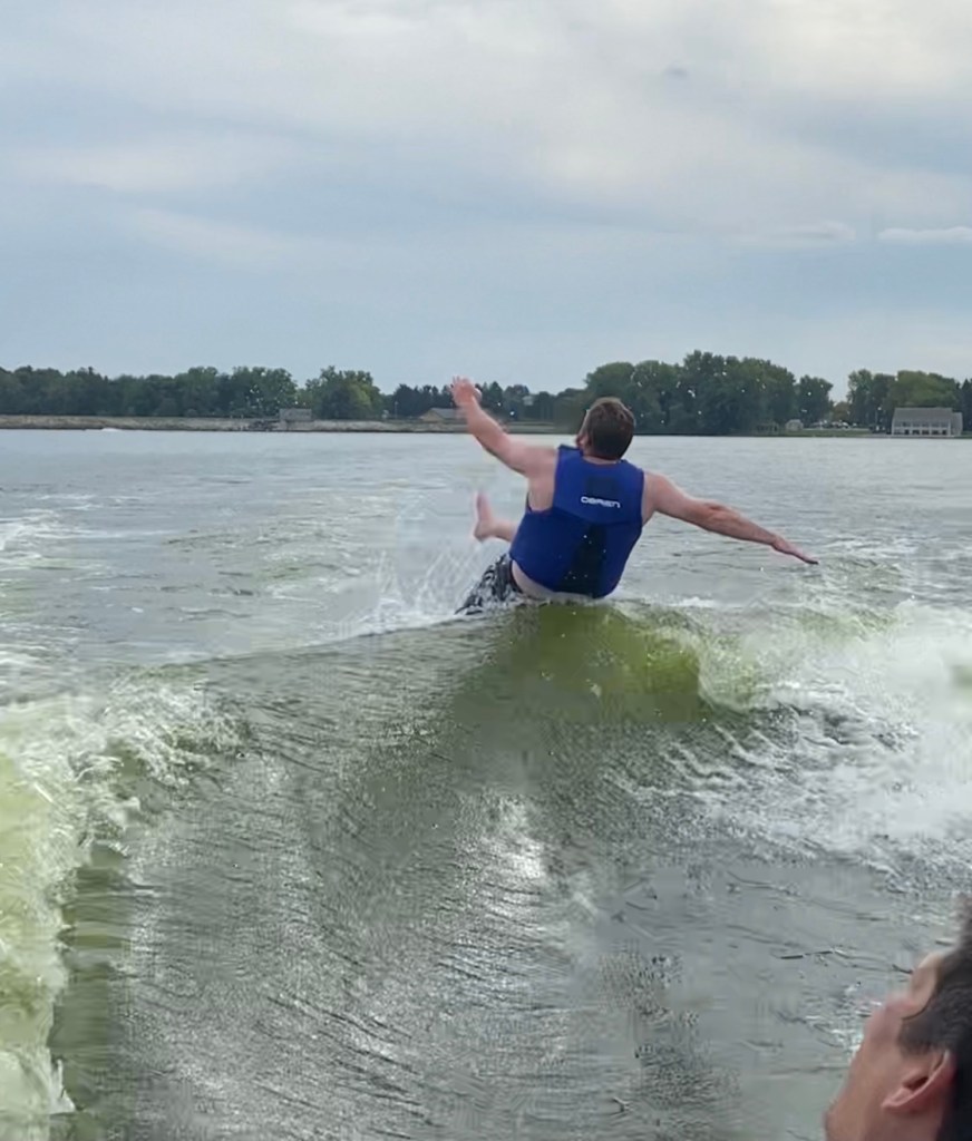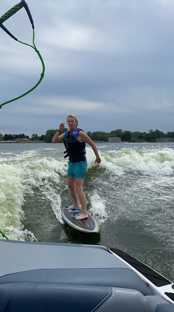 After lunch, I took an hour and went for a paddle board journey down the coast of the lake. By the time I got back, the family had returned from their days. We went back out on the lake, where I successfully surfed behind the boat with no rope! This might be my new favorite water sport. It was really fun and challenging. Kevin, the neighbor, successfully completed a 360 spin, that Tim and Whit tried to match unsuccessfully.