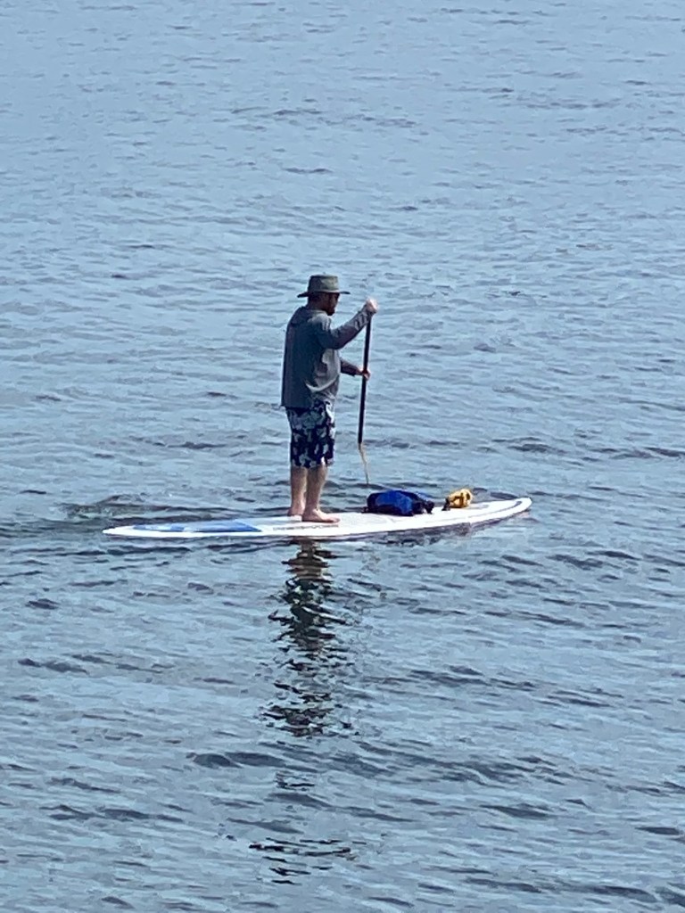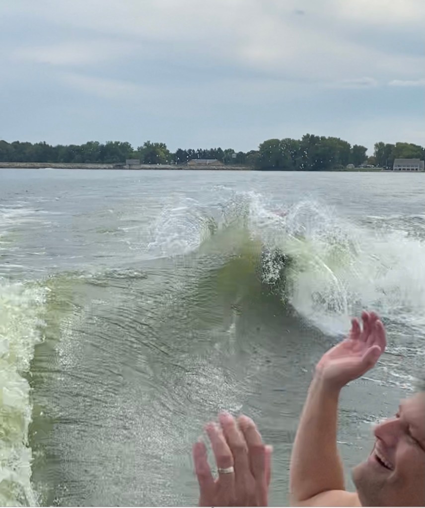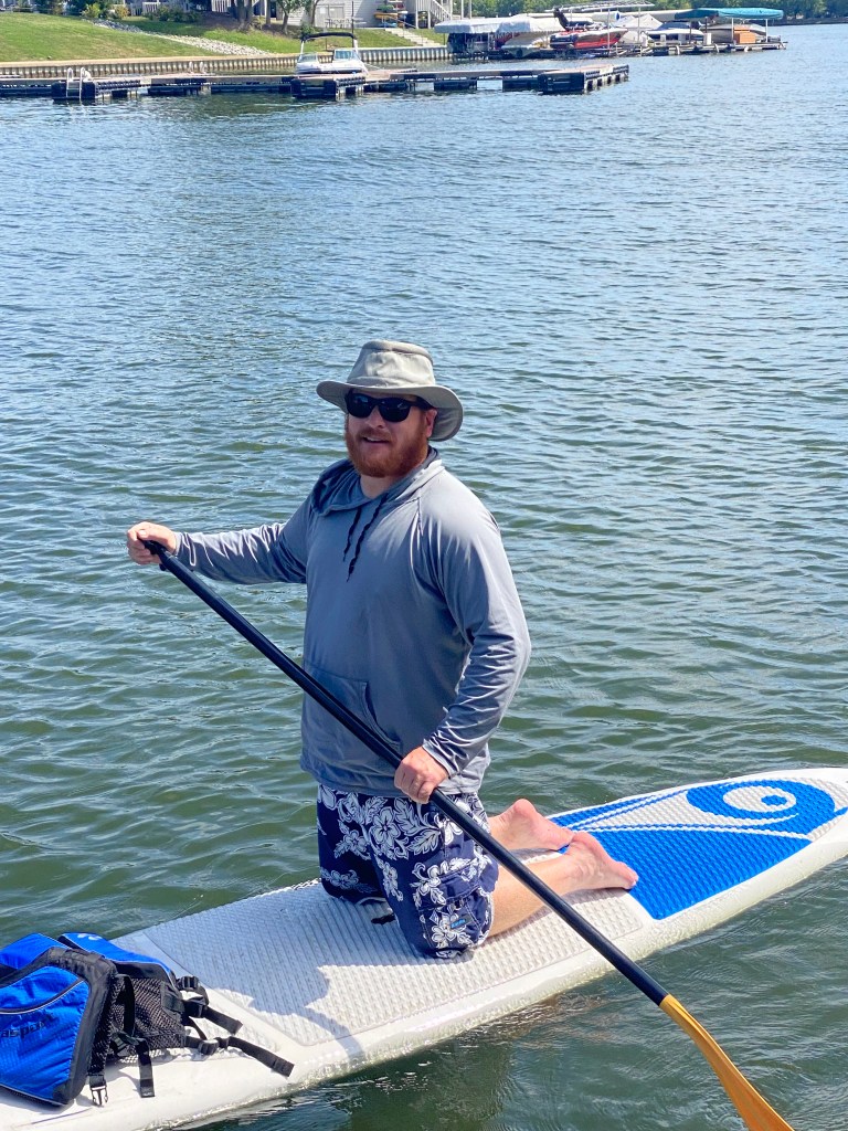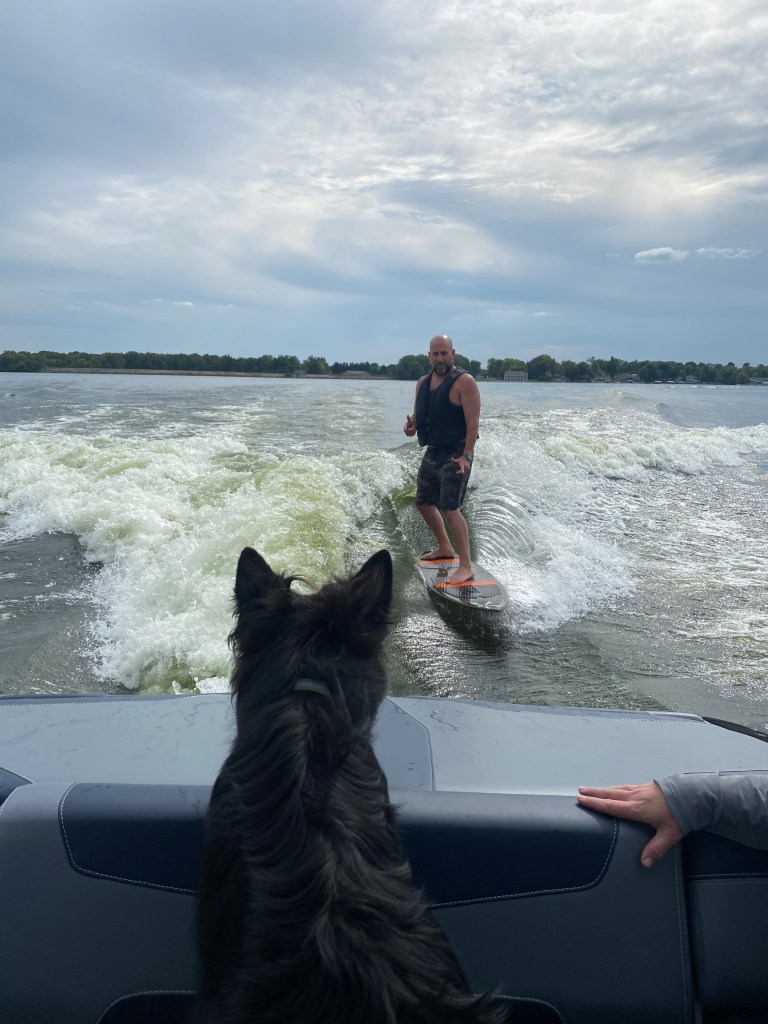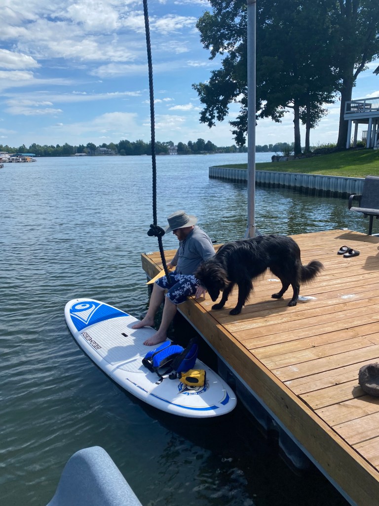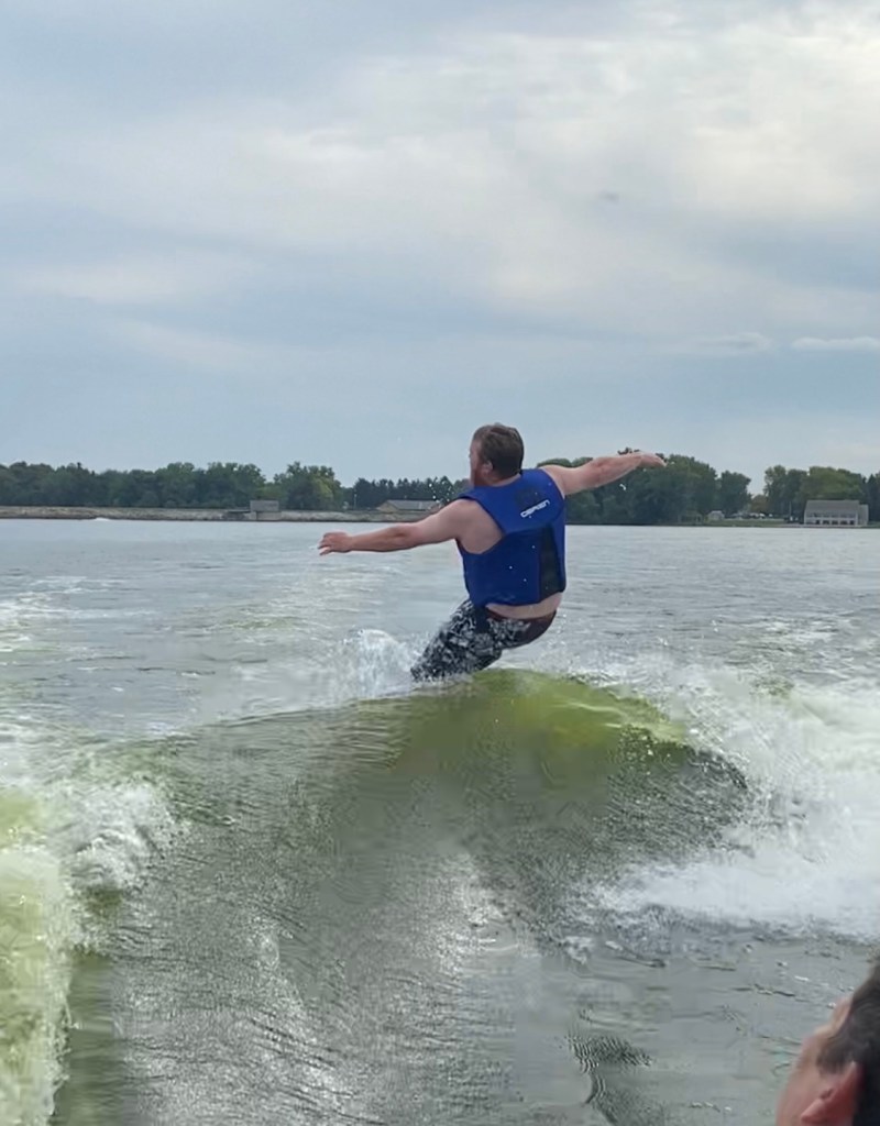 After lunch, I took an hour and went for a paddle board journey down the coast of the lake. By the time I got back, the family had returned from their days. We went back out on the lake, where I successfully surfed behind the boat with no rope! This might be my new favorite water sport. It was really fun and challenging. Kevin, the neighbor, successfully completed a 360 spin, that Tim and Whit tried to match unsuccessfully.