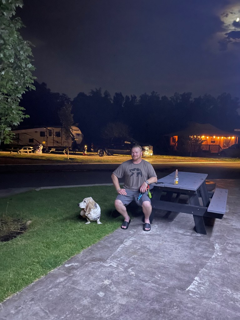 Bye Tennessee, Hello ArkansasGlad the RV is air-conditionedDad resting with Murph after his bumpy drive“How bumpy was it? you ask”Picturesque tower, this must be our campground, lol.Emmy practicing her map reading skills. Learning so much on this trip.Our first fire. Finally!Best friendsEmmy made the perfect s’more. Another great day.