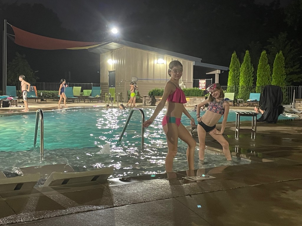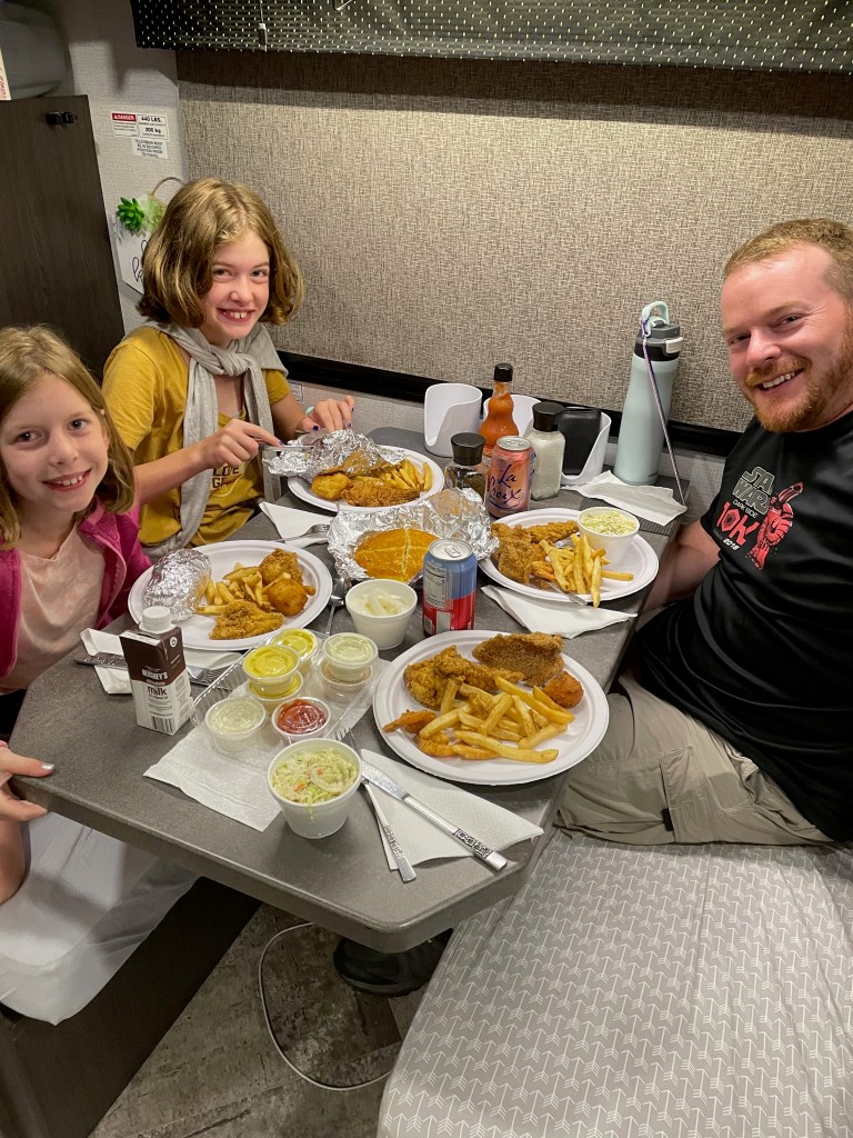 I would have spent the afternoon downtown just exploring, listening to music and people watching but I got outvoted. Good thing too because thunder storms rolled in by afternoon, it poured, and the news channels reported flooding in much of downtown. So a relaxing afternoon at the RV was a good call. Watching the kids enjoy the camper is great and a relief. Since we didn’t explore the sights this afternoon we were more adventurous with our dinner and ordered authentic southern food from the local Cock of the Walk restaurant and tried fried catfish, chicken, coleslaw and hushpuppies (my southern friends are used to seeing hushpuppies on the menu but not my NE girls!) When the rain stopped, the kids jumped in the pool for some night swimming. Summer memories! Stay tuned, the kids made some funny videos this afternoon!